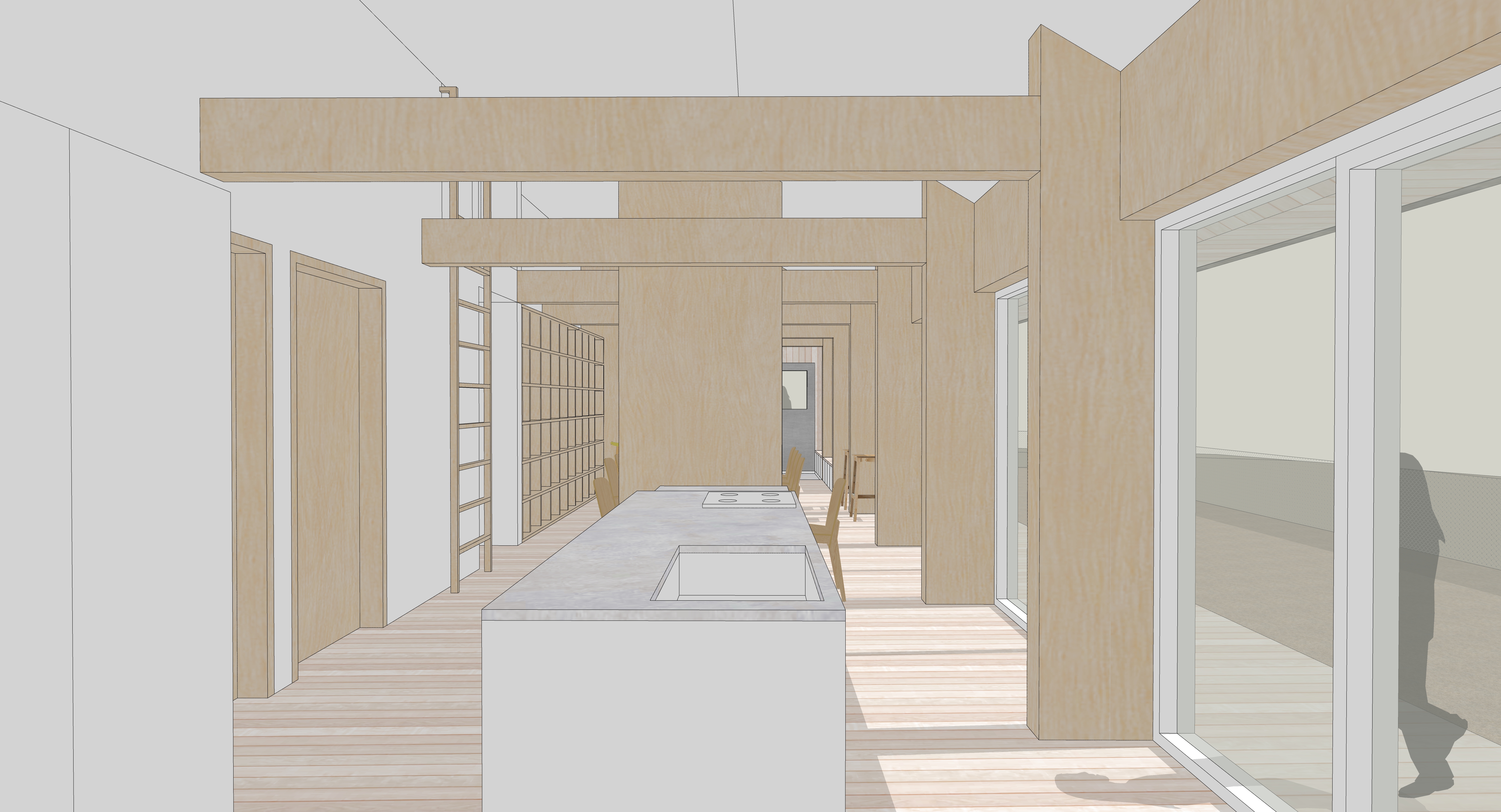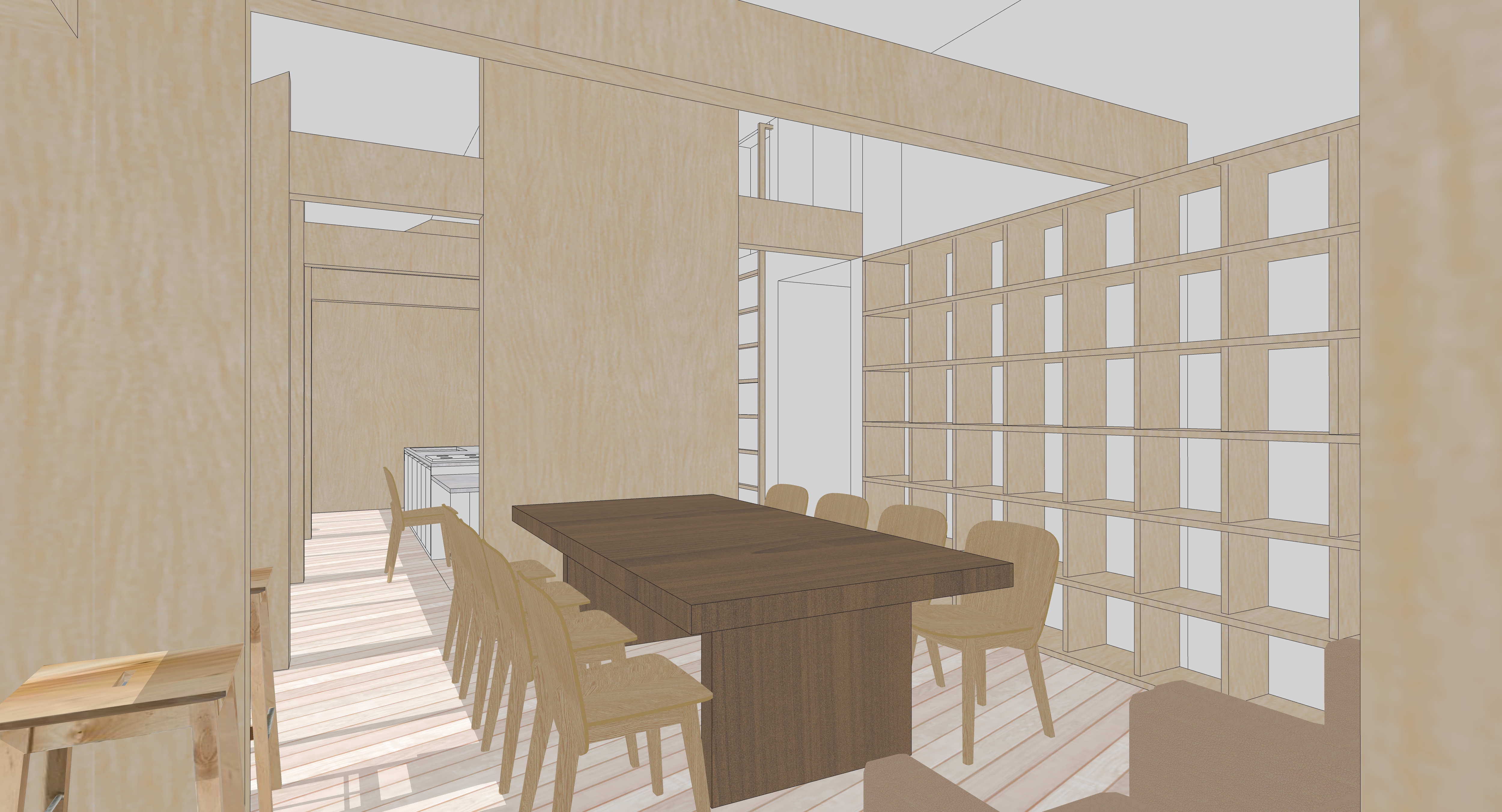 집의 뼈대는 목구조가 전제였으며, 시각적으로 독특하고 드러나지 않는 건물이길 원했다. 심지어 재활용 자재를 사용할 수있다면 그러고 싶다는 의지도 확인하였다. 가족의 옳바른(?) 공동체생활을 위해서 개인의 소유공간을 최소화하고, 가전제품이 공간의 주인으로 설계되는 것을 지양하기 위해서 텔레비전, 전자렌지, 전기밥솥, 식기세척기 등을 설치공간을 원하지 않았다. 솔직히 글을 쓰고 있는 나도 텔리비전과 전기밥솥, 식기세척기는 사용하지 않는다. 심지어 강제 기계환기를 위한 후드와 화장실 휀도 사용하지 않는다. 살아보니 없어도 별로 필료하지 않다. 창문을 잠깐 열어두면 환기를 어렵지 않게 해결된다. 억지로 시끄러운 기계소리를 들으며 후드와 휀을 사용하고 싶지 않았다.