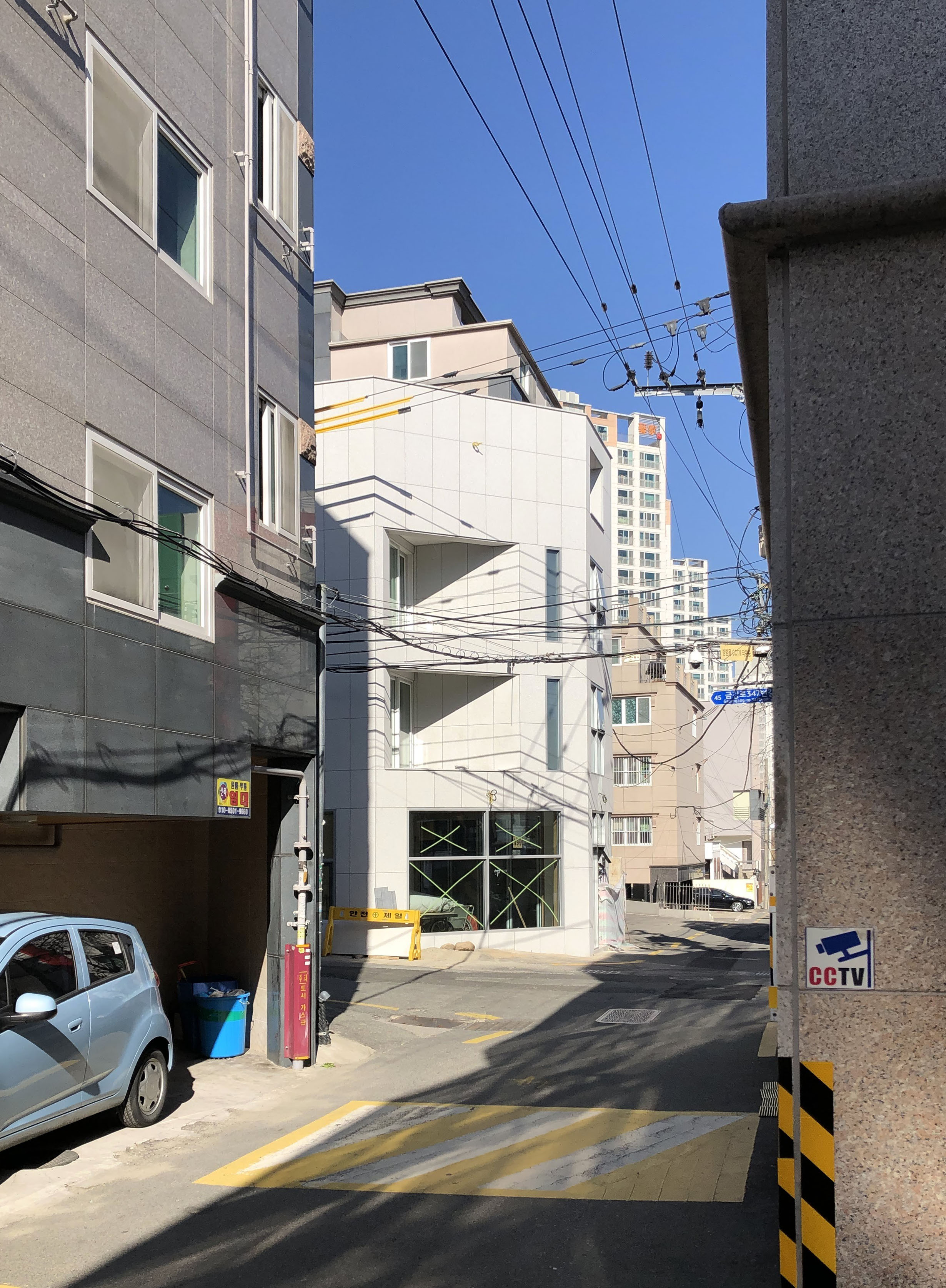 장전동 부산대학교 앞 상가주택(원룸)이 비계를 걷어내고 외관을 드러냈습니다. 주변의 높은 건물로 에워싸인 모서리 땅의 건물이다. 주변의 5층 또는 6층의 건물로 둘러싸인 3층 건물에 약간의 다락이 있는 건물이다. 상대적으로 낮고, 작아 보인다. 최대한의 건폐율로 일조권을 피한 최적의 용적으로 설계되었다. 어떻게 보면, 30평의 좁은 대지에서 할 수 있는 게 그렇게 많지 않은 듯하였다. 수직패턴으로 디자인(외장재, 창호, 난간 등)을 하여, 낮은 건물이 조금이 나마 눈에 드러나게 디자인하였다. 그리고 수직창으로 내부 깊이 채광이 되도록 하여 원룸의 답답함을 줄이기 위함이다. 밝은 공간은 좁은 공간(원룸)을 넓게 느끼게 해 주고, 폐쇄적인 기분을 줄여준다. 이곳을 거쳐가는 학생들과 사람들에게 좋은 기억이 남는 집이었음 한다.