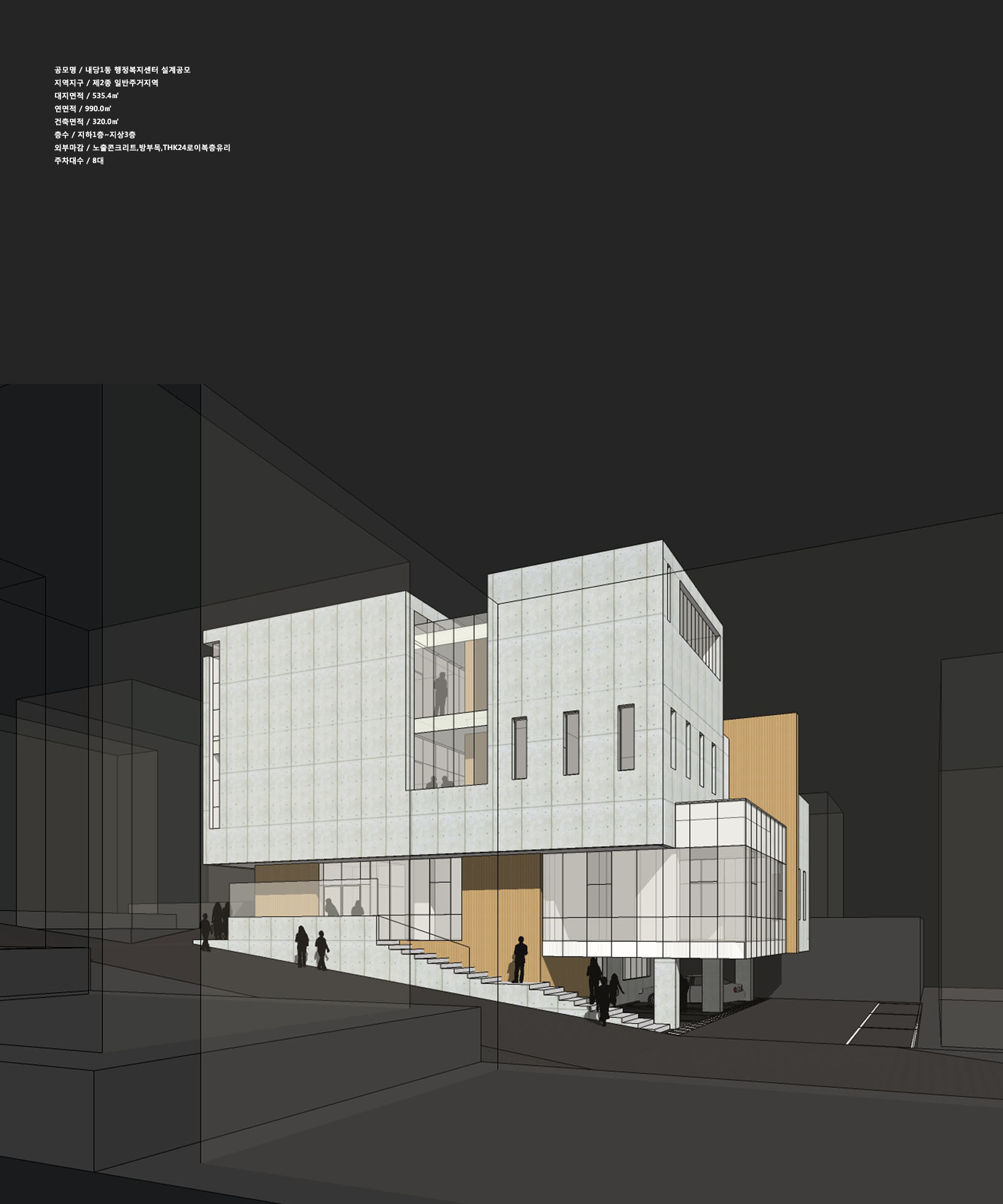지역지구 / 제2종 일반주거지역 대지면적 / 540.0㎡ 용도 / 제1종근린생활시설(공공업무시설) 연면적 / 990.0㎡ 건축면적 / 320.0㎡ 규모 / 지하1층~지상3층 외부마감 / 노출콘크리트,방부목,로이복층유리 주차대수 / 8대