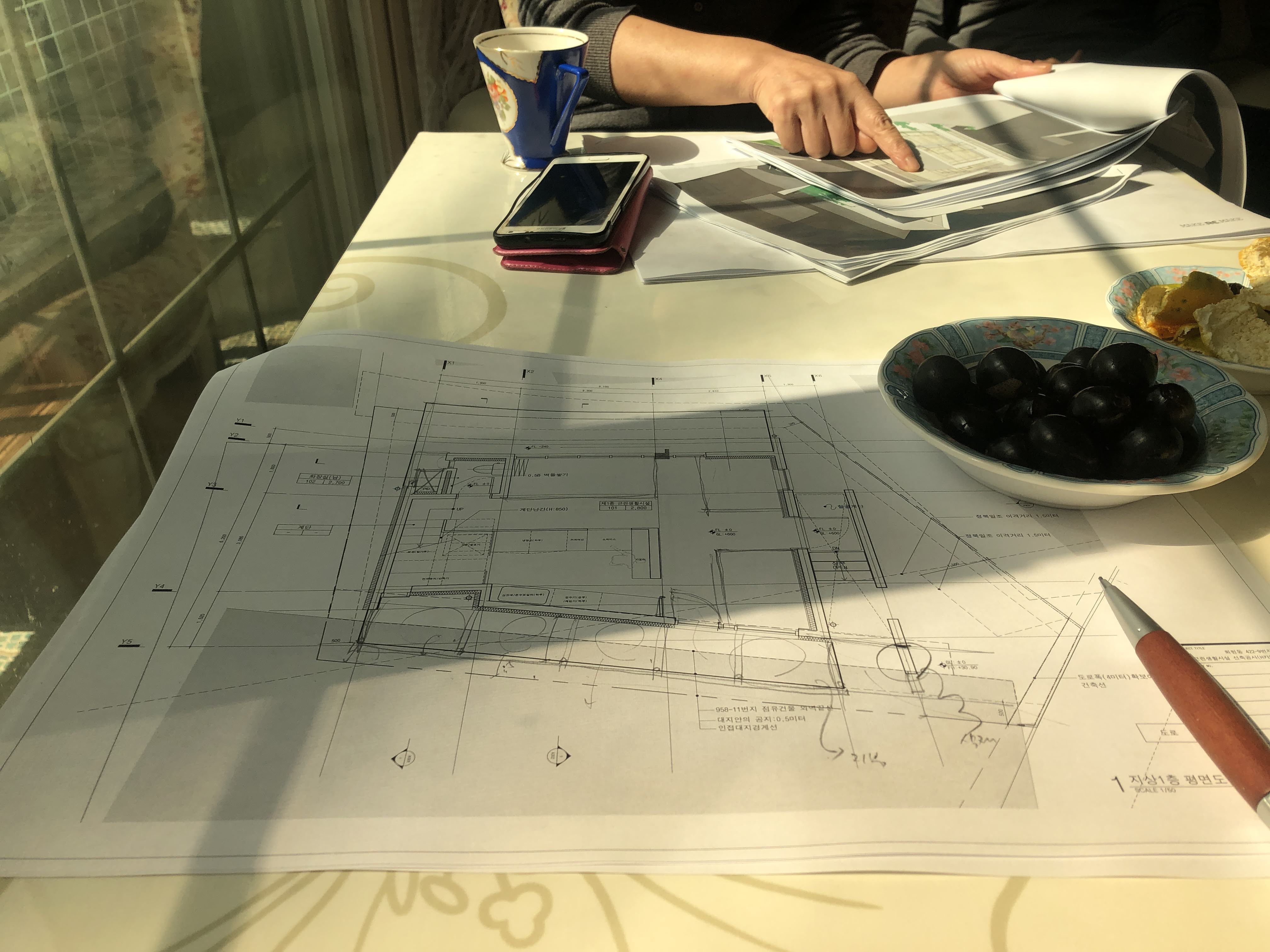 H카페 회의중: 열정적인 카페사장님과 5번째 미팅중이다. 공사하기 좋은계절에 설계를 하고 있다. 시원한 공기와 따뜻한 햇살, 카페 사장님의 입담으로 회의가 재미나다.