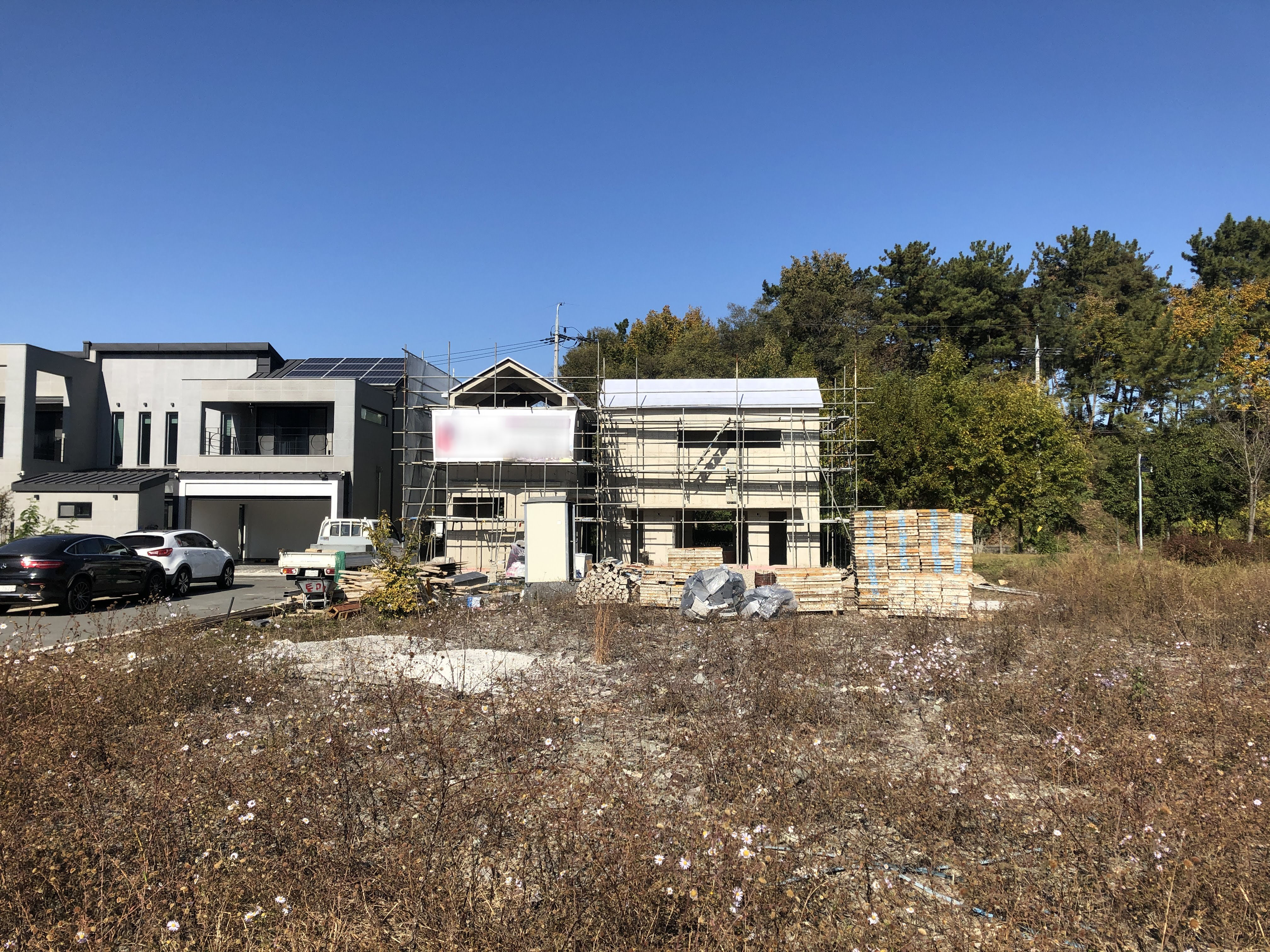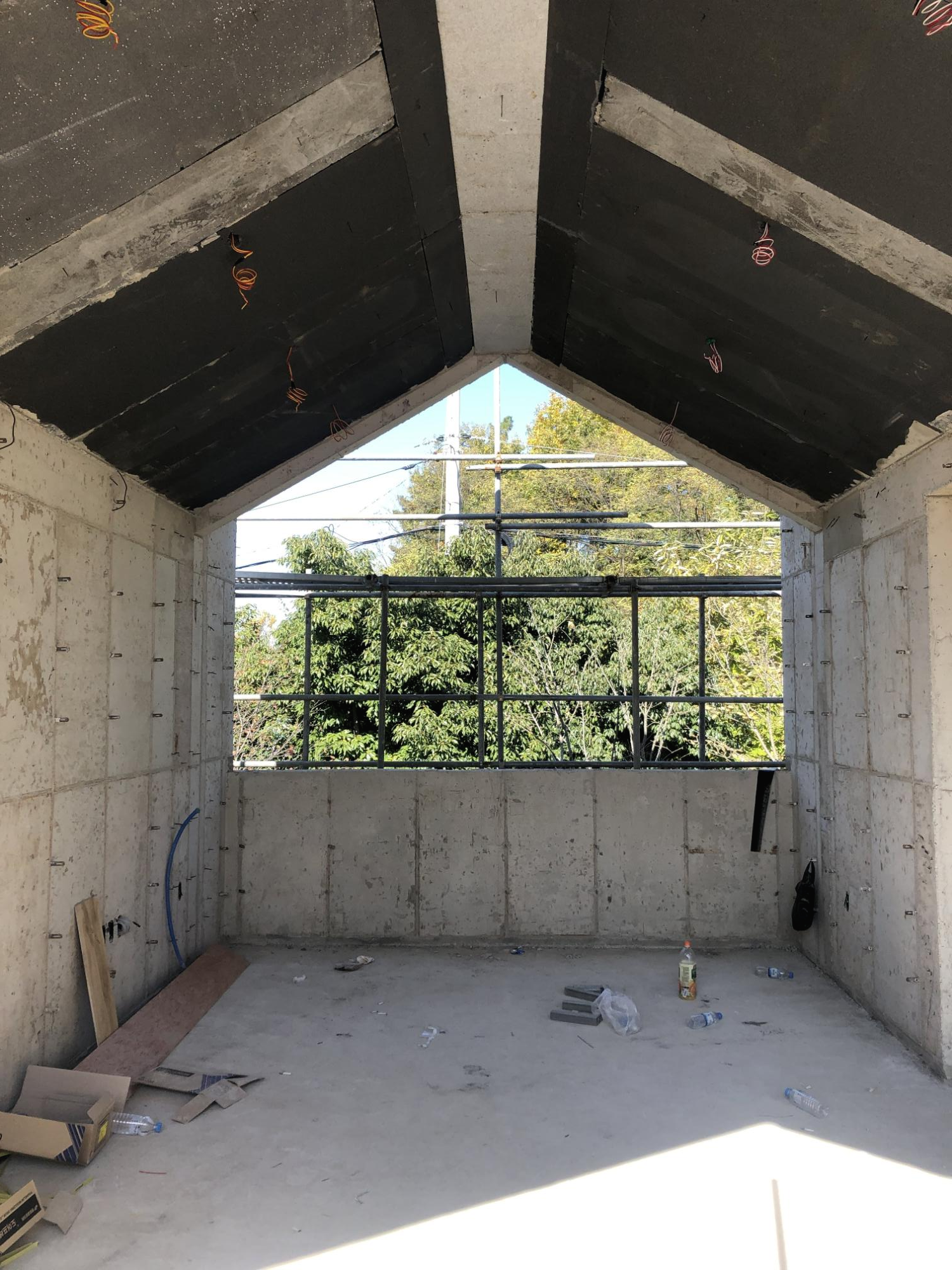 착공후 터파기부터 시작해서 지붕타설에 이어 거푸집 해체까지 50일 정도의 시간이 흘렀다. 이제는 건물의 모습이 드러났다. 쿨데삭 도로구조의 끝에 위치한 cm주택은 옆건물 방향으로는 주차장을 설치하고, 프라이버시를 보호하기 위해서 최소한의 창을 설치하고 벽으로 구성되어 있다. 그외의 입면으로는 정면과 측면, 배면의 세면이 모두 비슷한 모습을 하고 있다.