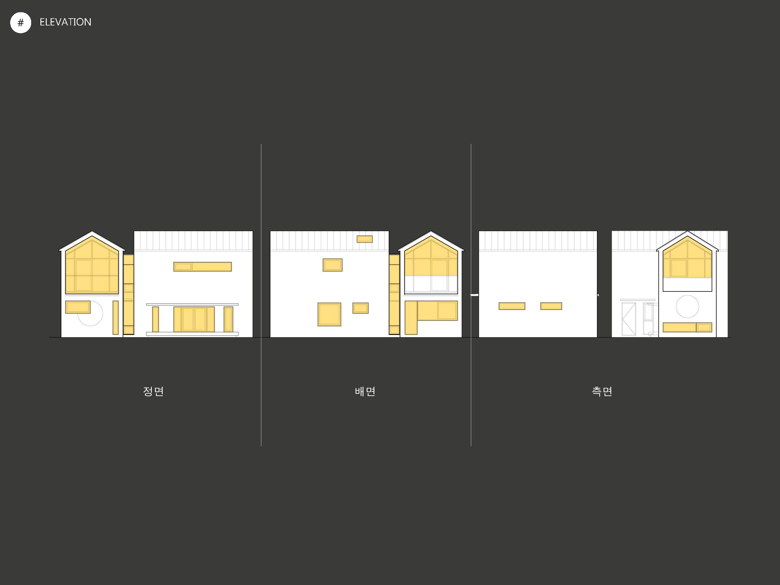 '남향으로는 겨울철의 깊은 채광과 조망을 위한 박공구조, 동향으로는 아침햇살과 연결녹지를 향한 조망, 북향은 도로면의 소음을 차단하며 동시에 거실에 앉아 높은 나무의 푸르름을 만끽하는 공간으로 세가지의 박공구조'로 디자인되어 있다. 이 세면의 박공구조는 그대로 내부공간으로 이어지고, 외부의 조망으로 연결된다. 그리고 비슷한 박공의 공간의 구조는 2층 실내에서도 연속성을 가지고, 그 분위기를 이어간다. 마치 하나의 공간으로 인식되길 바랬다.