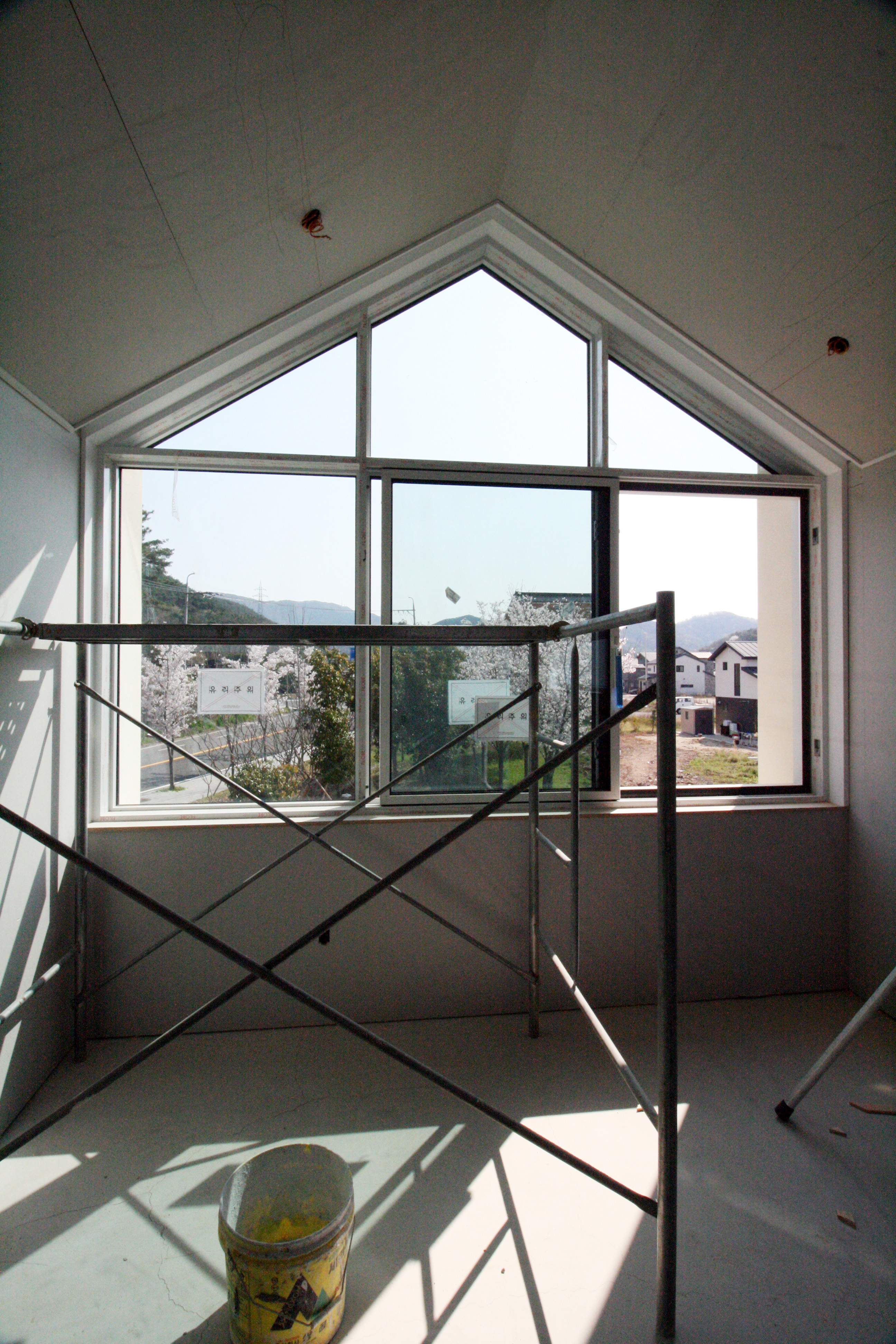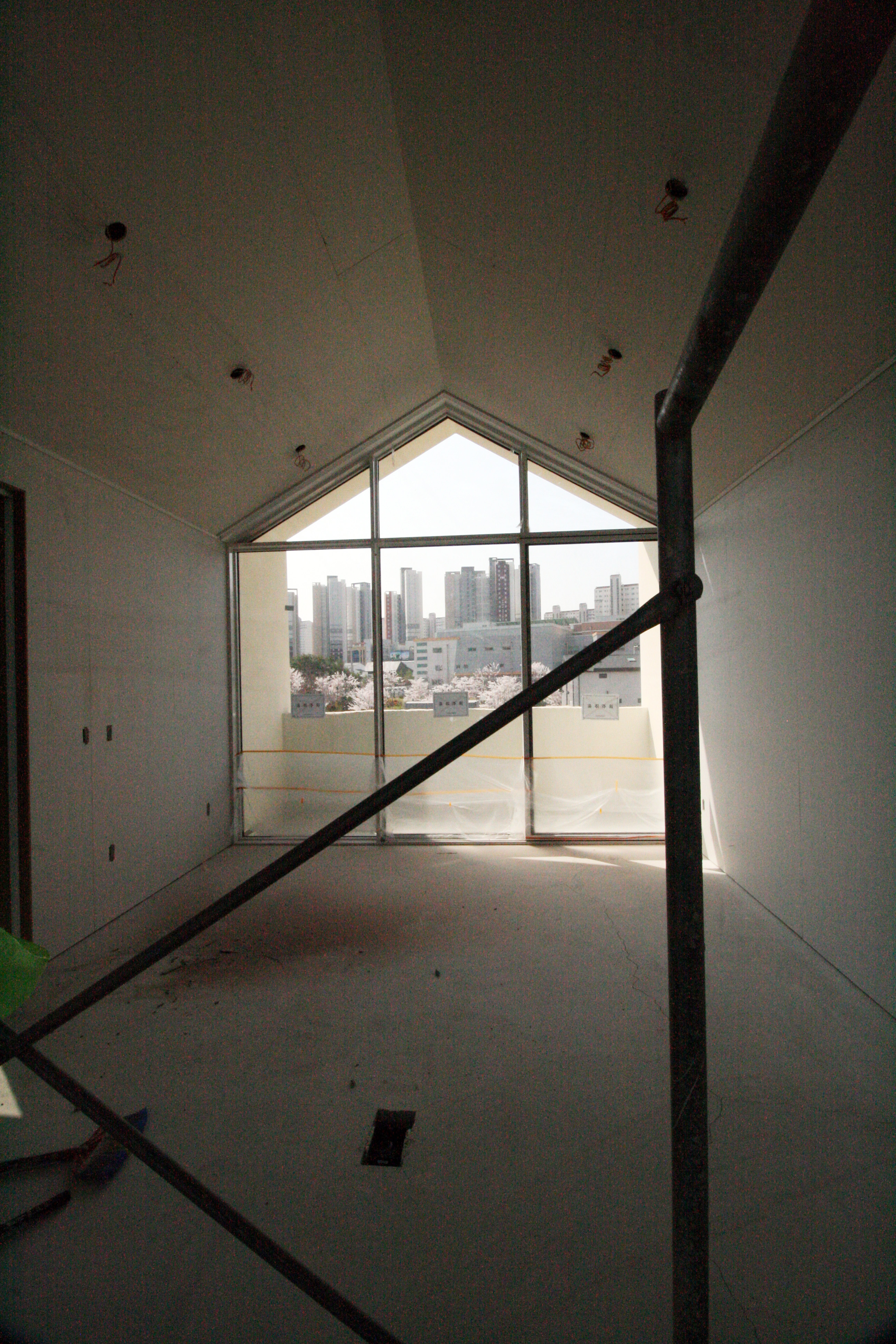 측면의 안방창 또한 박공형태이다. 여기 또한 건물의 입체감을 주기위해 입면의 모습이 약간 안쪽으로 들어가 있다.입체감을 부여하기 위한 노력이다. 안방인데 큰 창을 낼 수 있었던 것은 이 방향이 공공녹지공간이기 때문이다. 매일 눈부신아침을 맞이하게 될 것이다. 이제 늦잠은 불가능할지도 모른다.