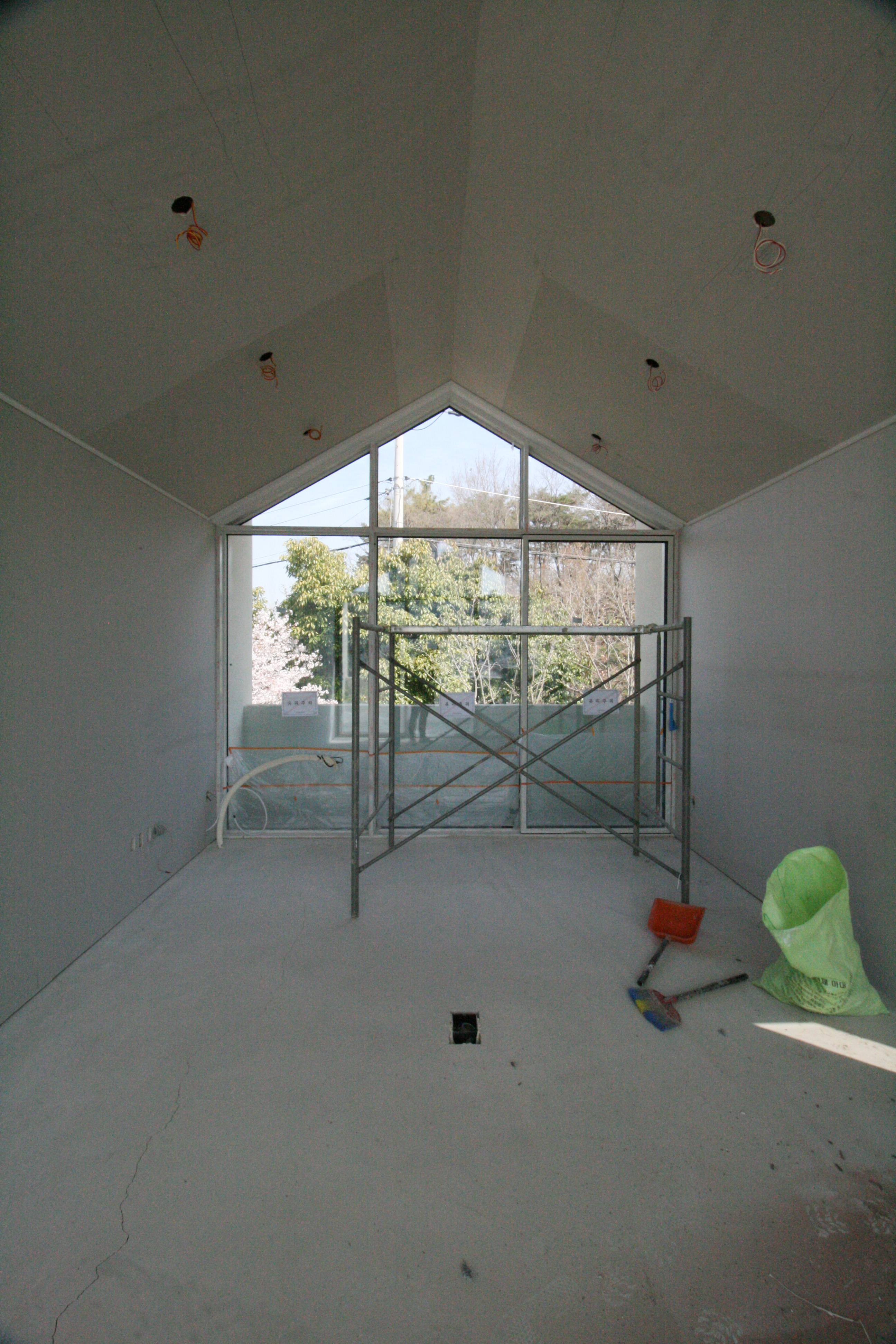 진입부분 정면, 2층 거실은 뒷쪽으로 관통하는 시원한 공간으로 외부와 내부의 공간이 박공의 모습으로 고스란히 전달하고 싶었다. 정면과 측면과 후면의 박공부분은 태양빛에 의해 건물의 입체감을 표현하기 위한 노력이다. 해가 떠서 질때까지 정면의 박공모습을 매순간 다를 것이다. 건물의 형태와 공간이 단순해지려고 하는 것은 빛으로 인해서 그 공간의 변화를 더 잘 알기 위함이다.