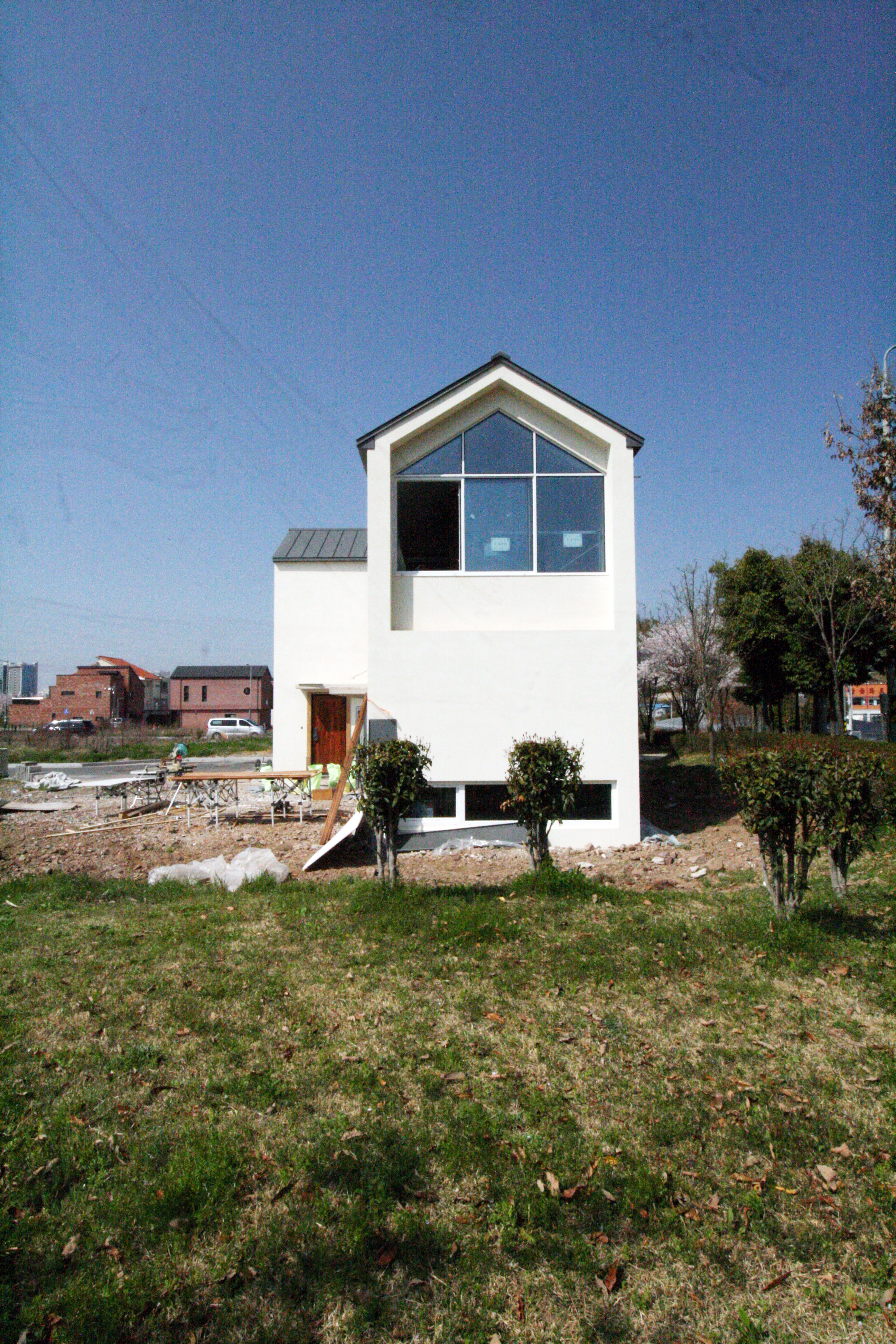 건물에서 보여지는 장식을 최소화하려고 하였다. 여러 가지 이유가 있지만, 가장 중요한 이유는 건물 외관의 화려함보다 태양빛과 교감하는 건물의 다양한 얼굴을 더욱 잘 인지하기 위함이다. 계절과 시간에 따라 정면의 모습은 빛과 음영에 의해서 깊이감이 달라지고 그것이 고스란히 공간에 전달될 것이다. 그 모습이 사는 사람에게 더욱 잘 전달되기 위해서 최대한 단순해지길 원했다. 정면의 가로로 긴 창도 없애버릴까 고민을 많이 했던 부분이다.