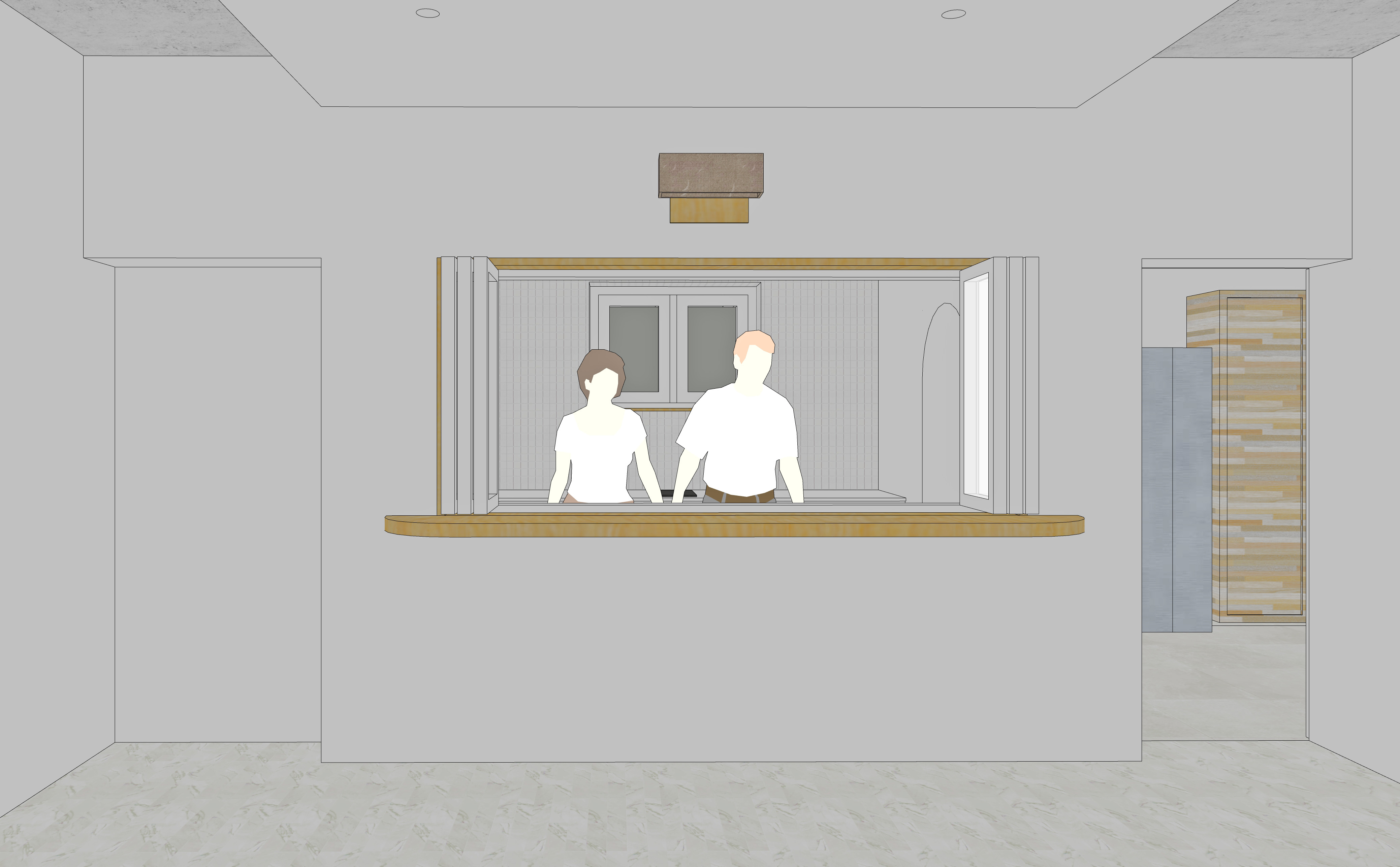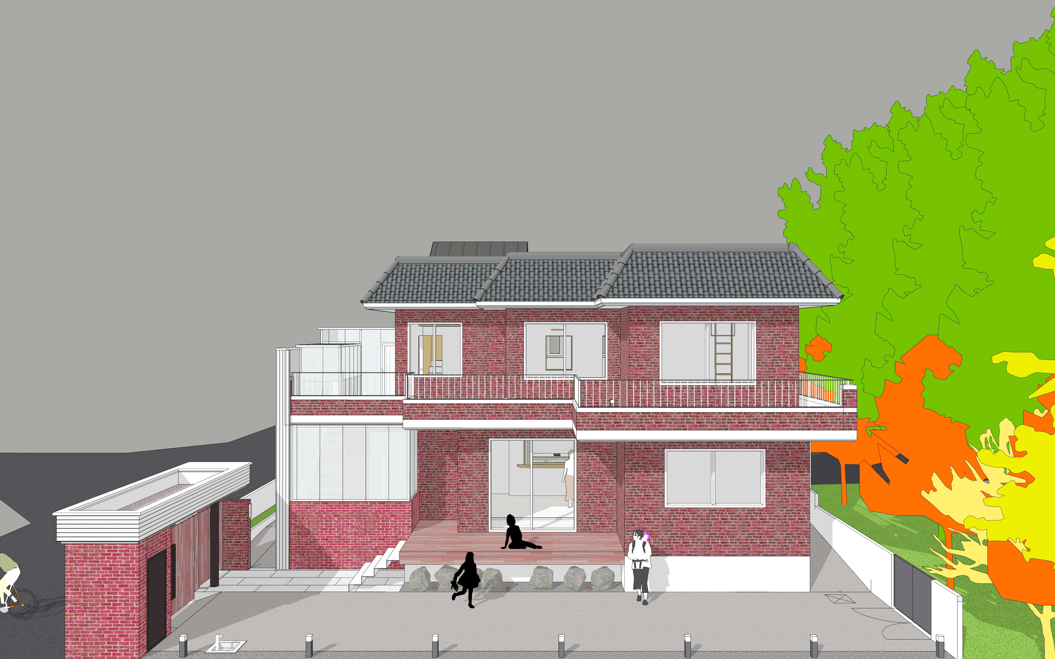 1층과 지면의 경계를 줄이고 마당의 활용을 조경보다는 활동을 위한 공간으로 비워두려고 한다. 창문을 바닥까지 내려 현관문 대신 내외부를 왕래하기 쉽게 하였다. 왼쪽 대문으로 들어오면 바로 1층으로 진입하는 계단을 만들어 두었다.