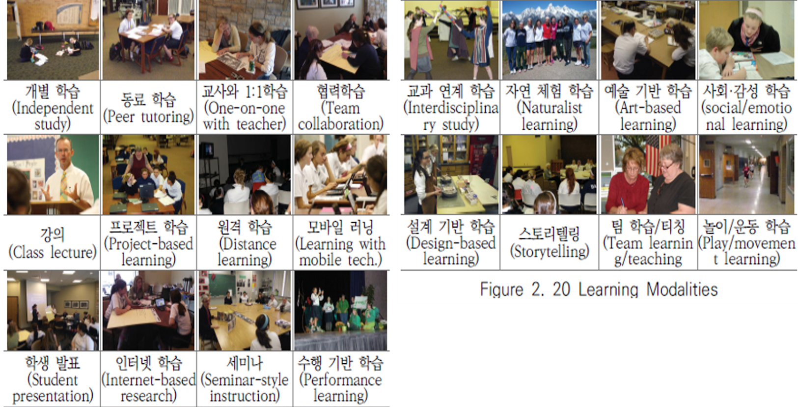 개별적인 자주적 학습, 친구와 동료학습, 교사와 1:1 학습, 모둠으로 구성된 협력학습 등 그룹이 필요한 학습방법이 있으며, 프로젝트 기반의 학습, 모바일러닝, 인터넷학습, 수행기반학습 등 강의수업 외에도 스스로에게 질문하며 답을 찾아가는 학습방법도 필요해졌다. 놀이나 운동, 예술, 사회, 감성학습과 같은 체험을 통한 학습도 필요해졌다. 강의 외에도 다양하게 학습으로 배움의 방법과 범위를 키워나갈 수 있게 되었다.