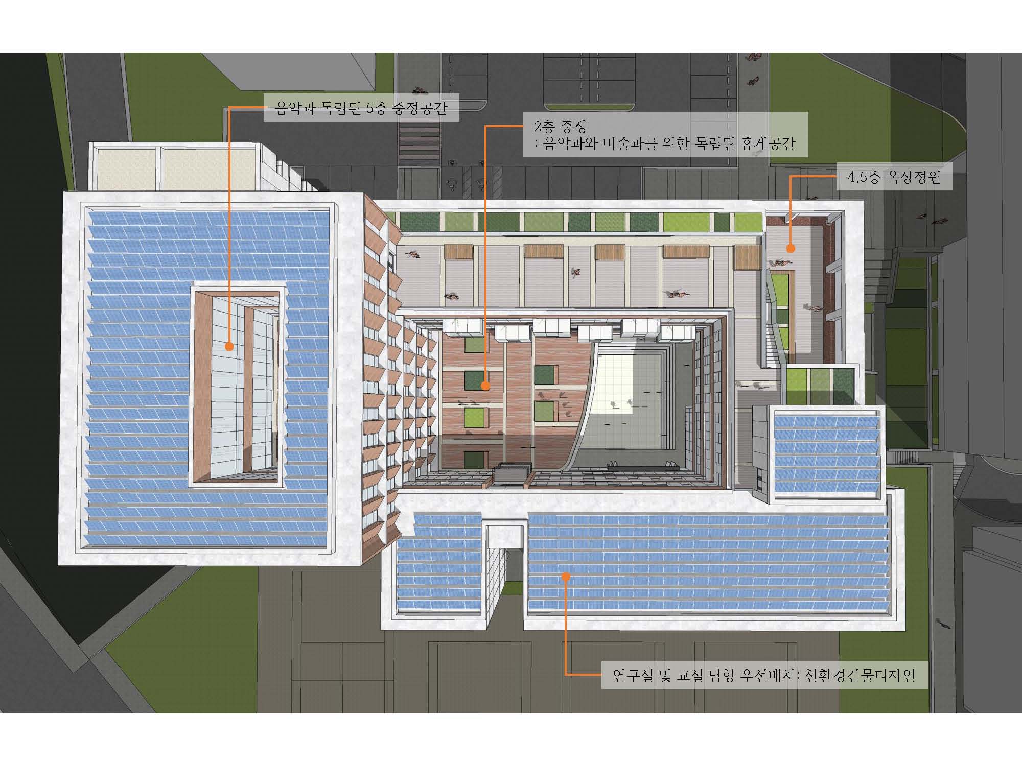 음악과와 미술과의 수업방식 및 환경을 고려한 건축물 계획이 되어야 하며, 두 과가 통합되면서 예술관의 사용자인 학생들의 커뮤니티를 유도할 수있는 공간구성이어야 할 것이다.