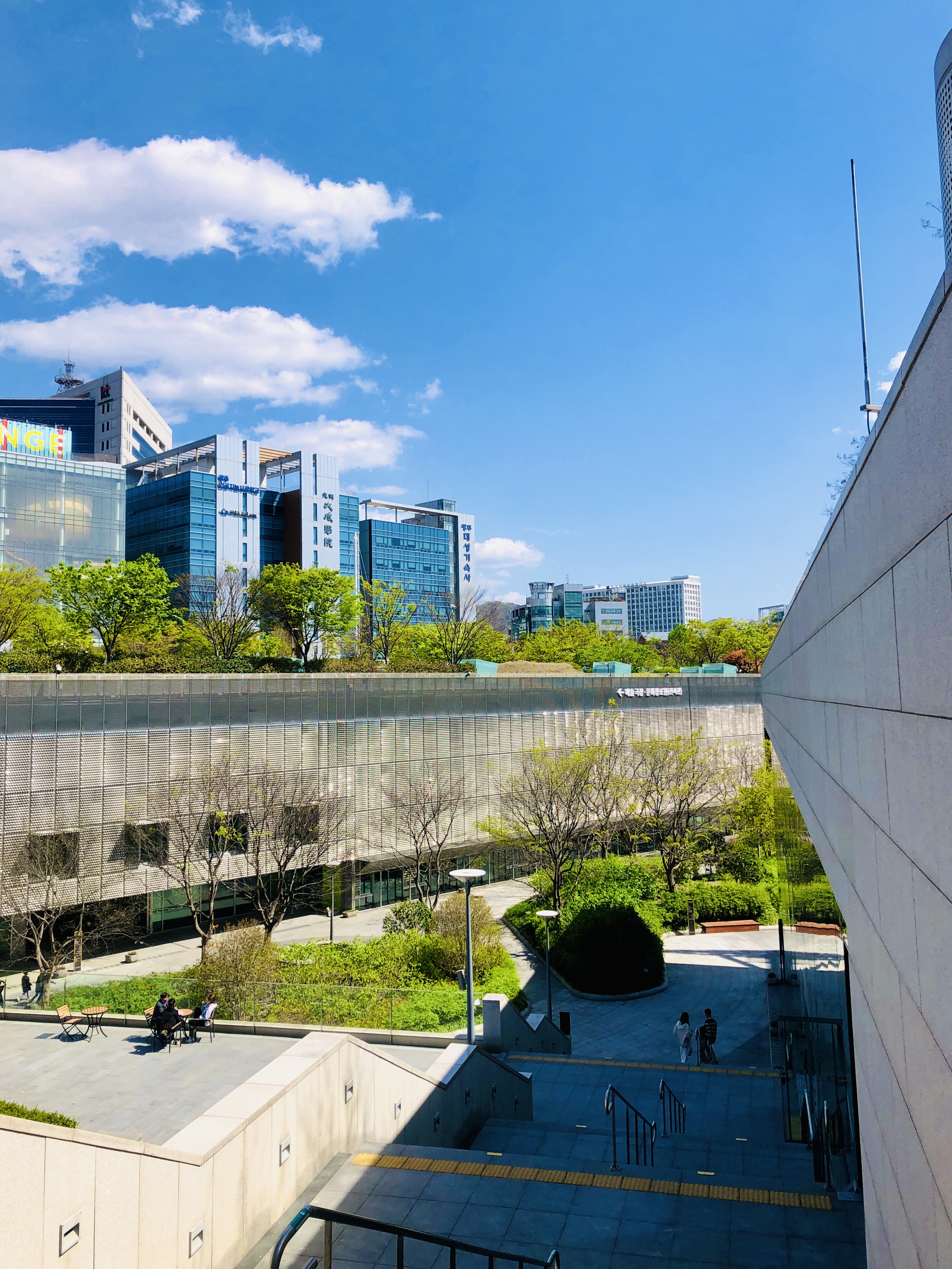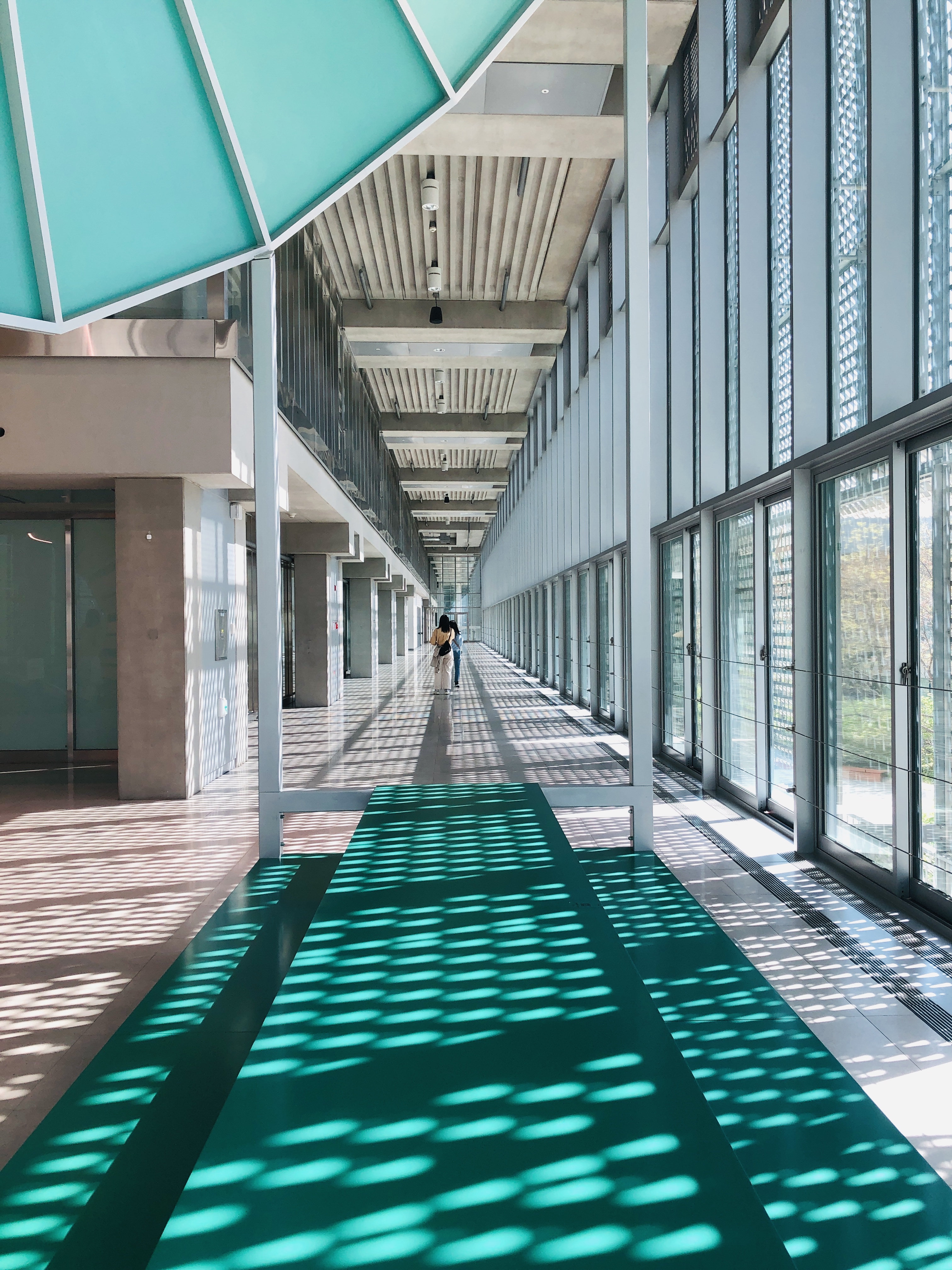 외부파사드 타공판 시스템은 여러가지의 타공크기를 검토하기 위해서 1:1 모형의 MOCK UP테스트를 통해 문화정보원과 창조원을 가르 지르는 복도의 외피에 접목되었는데, 이 외피는 유리와 금속타공판으로 구성되어 낮에는 태양의 빛이 내부로 유입되고, 밤에는 건물 내부의 빛이 광장으로 스며 나오게 설계되었다고 한다. 야간에 방문을 해보지 못해 어떤 경관을 연출할지는 눈으로 확인해보지 못했지만, 기능과 미의 관점에서 동시에 고민된 결과물이다. 그리고 더 나아가 주광에 의해 복도에 펼쳐진 음영의 패턴은 시간순으로 그 모습을 변화시켜 흥미롭게 만든다.