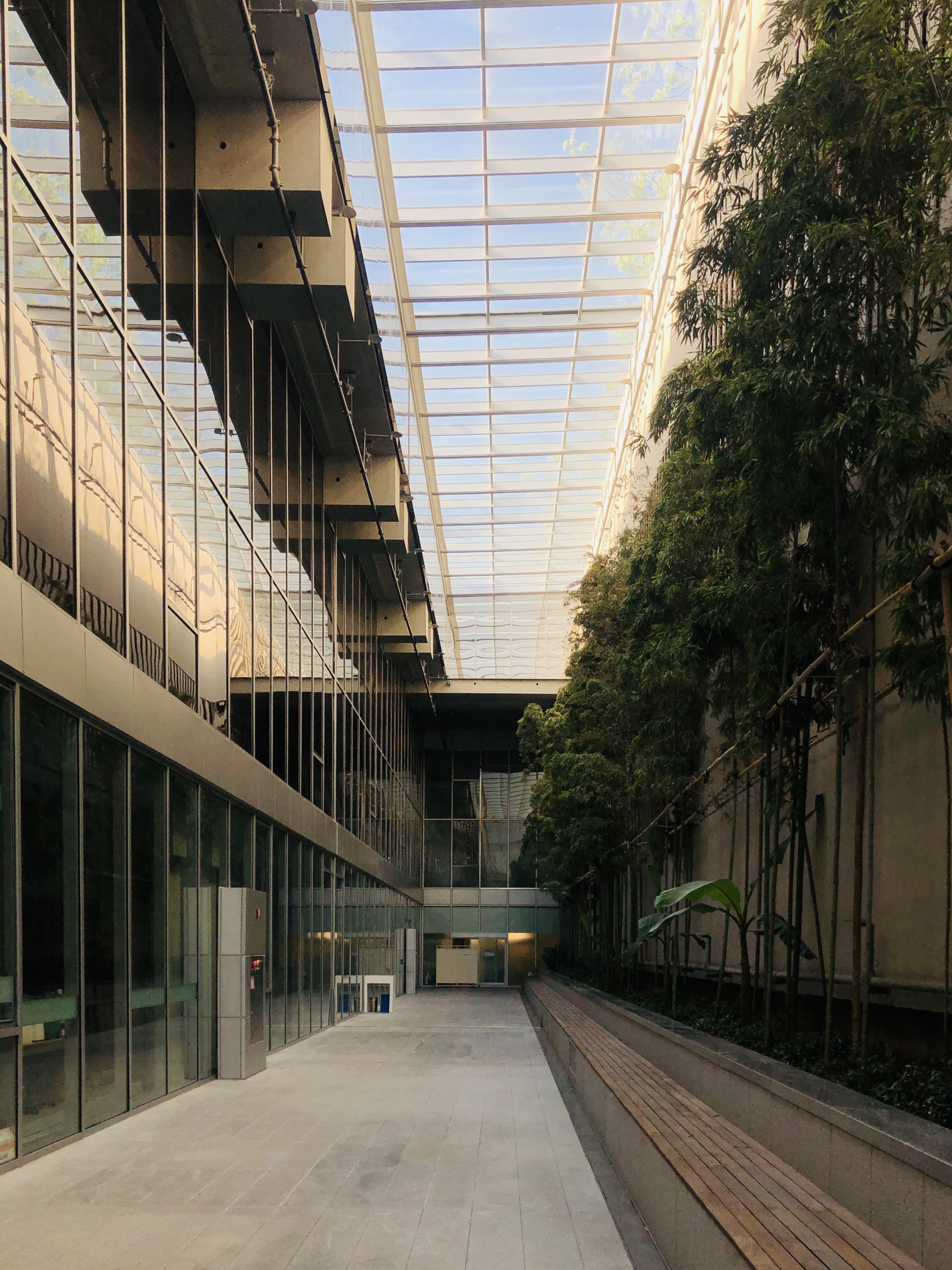지하에 있는 대나무정원 기능으로 이해하면 지하층의 건조공간(dry area)에 해당하지만 지하의 단점을 해결하기 위한 공간으로 주광을 끌어들여 내부의 경관과 쉼터를 제공하는 일종의 아뜨리움이다.