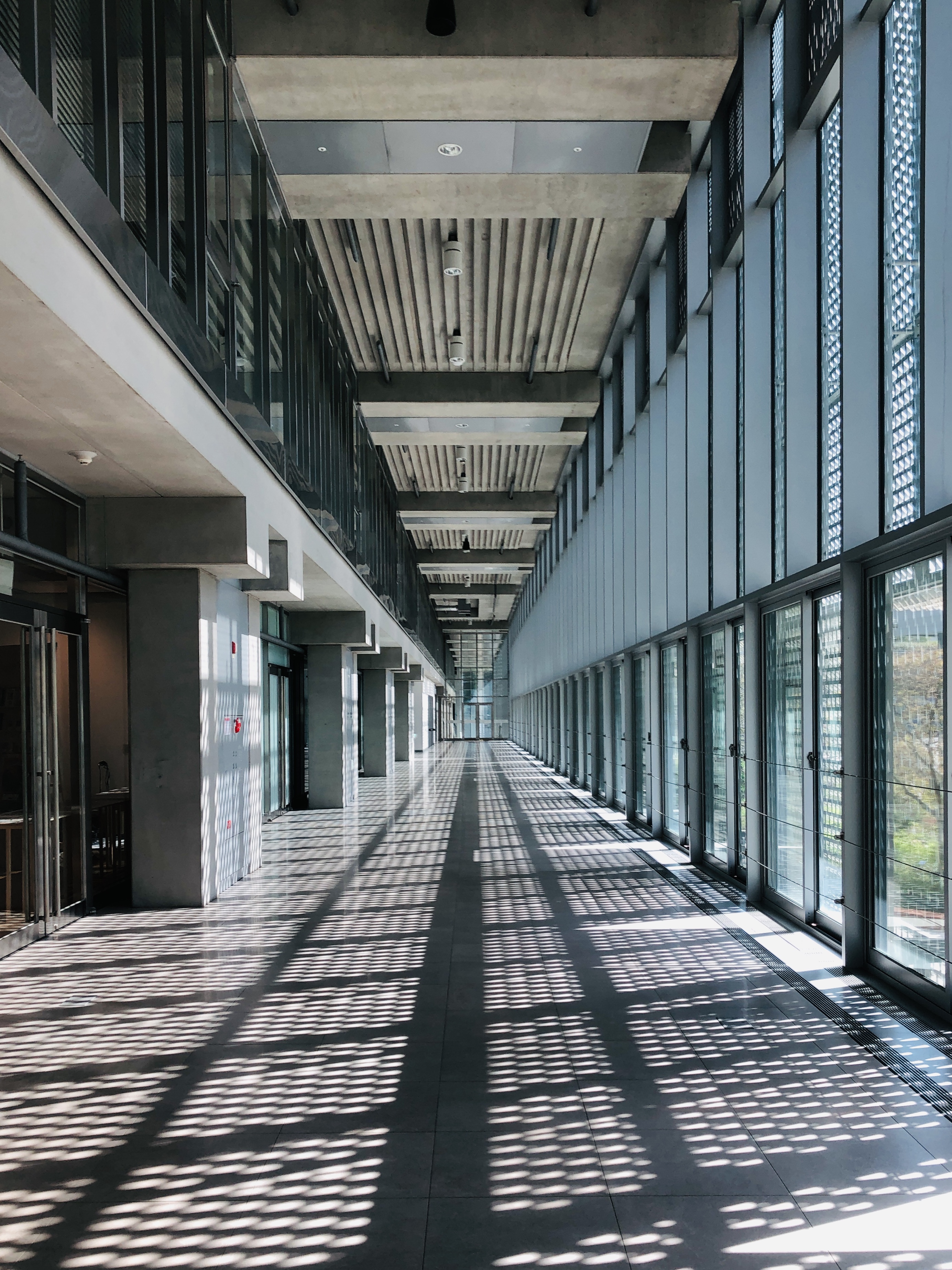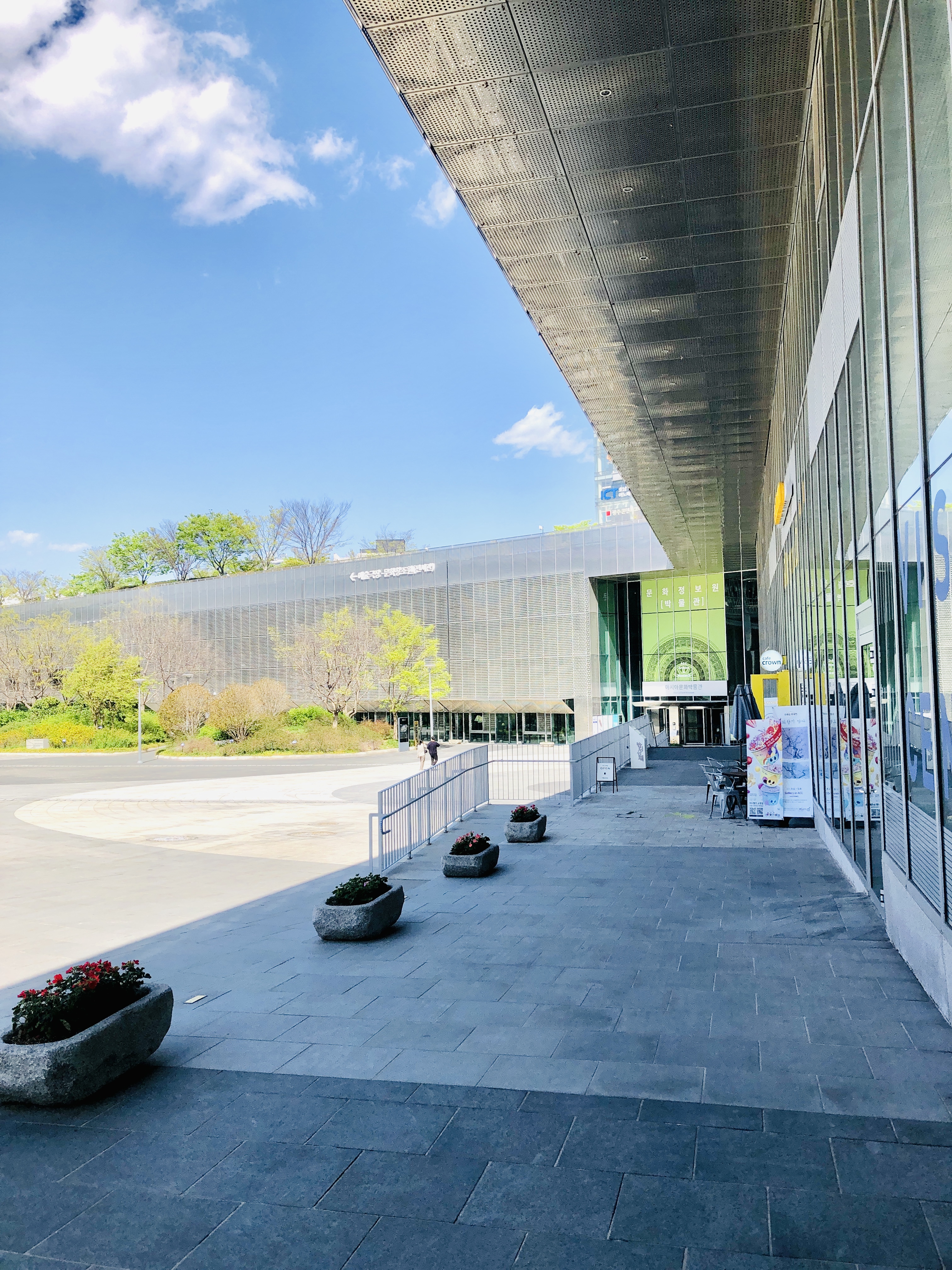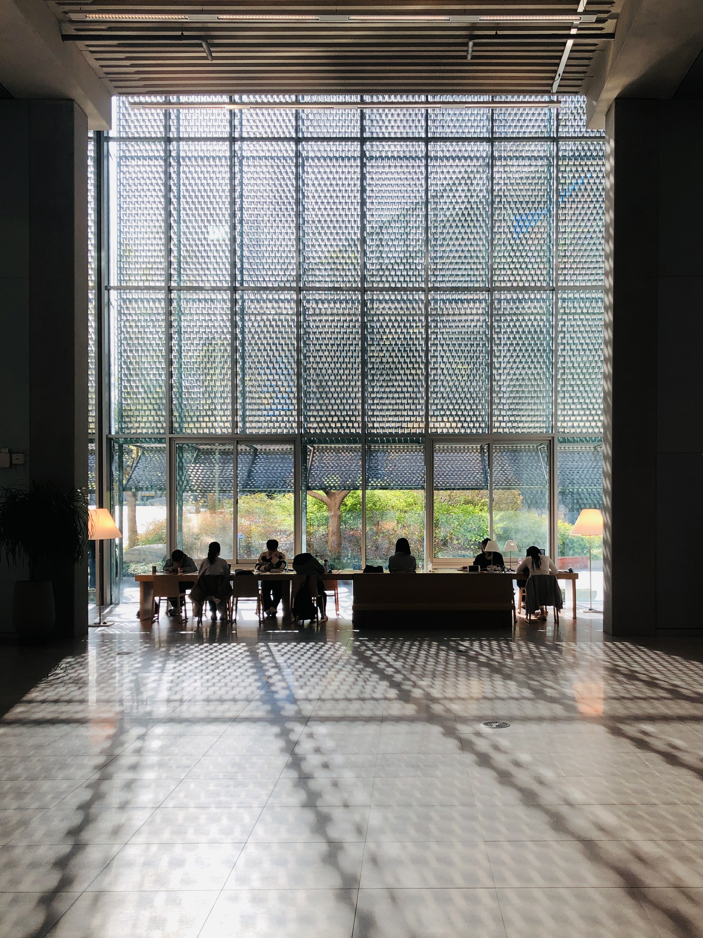 외부파사드 타공판 시스템은 여러가지의 타공크기를 검토하기 위해서 1:1 모형의 MOCK UP테스트를 통해 문화정보원과 창조원을 가르 지르는 복도의 외피에 접목되었는데, 이 외피는 유리와 금속타공판으로 구성되어 낮에는 태양의 빛이 내부로 유입되고, 밤에는 건물 내부의 빛이 광장으로 스며 나오게 설계되었다고 한다. 야간에 방문을 해보지 못해 어떤 경관을 연출할지는 눈으로 확인해보지 못했지만, 기능과 미의 관점에서 동시에 고민된 결과물이다. 그리고 더 나아가 주광에 의해 복도에 펼쳐진 음영의 패턴은 시간순으로 그 모습을 변화시켜 흥미롭게 만든다.
