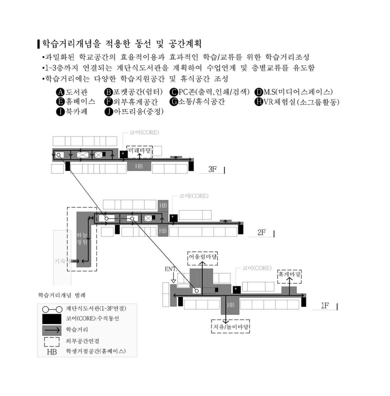 : 입체적 공간조성, 교과학습과 연계, 수직적 소통 및 휴식 공간확보