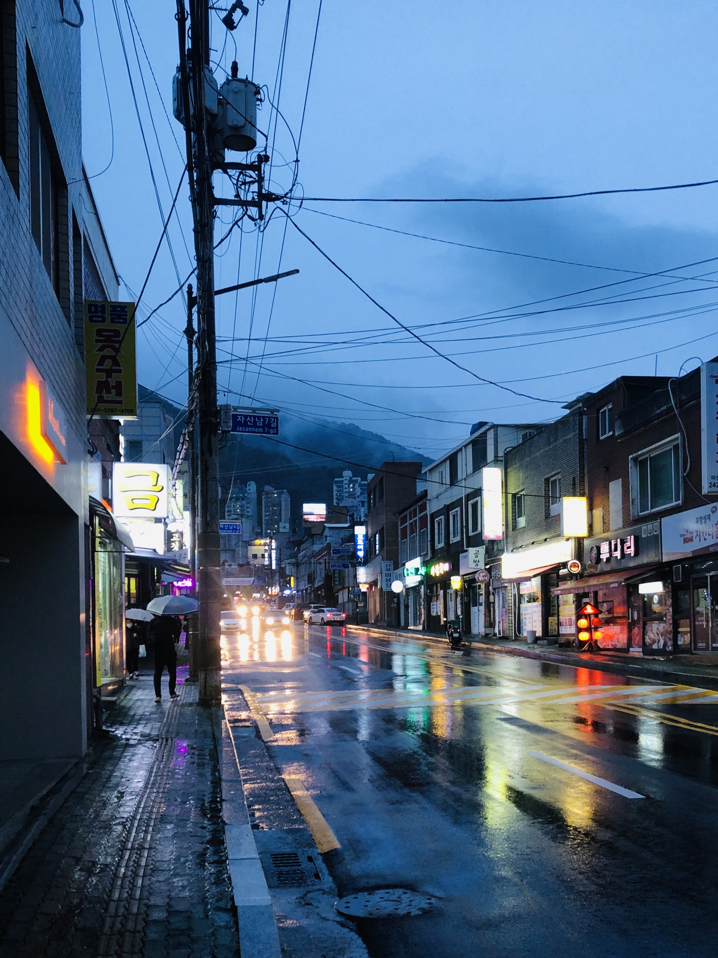아직 어둠이 오기전 밝게 켜진 색색의 네온사인과 촉촉히 젖은 도로에 비춰진 네인사인 그리고 비 비린내, 빗길을 밟고 지나가는 자동차소리, 낭만은 지금 이 도시에 있지 않을까? @4월 비오는 저녁7시, 마산