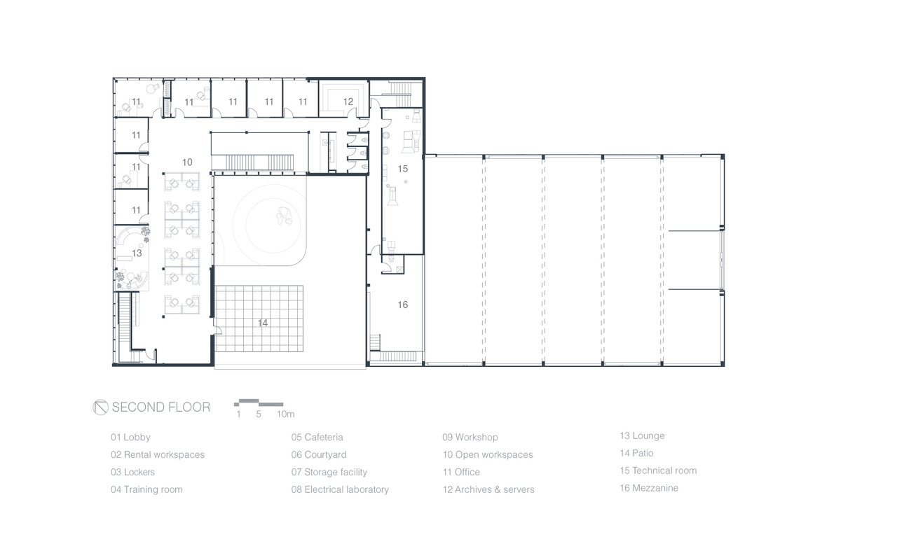 로비에 면해서 임대작업실이 배치되어 있으며, 사용자의 편의를 위한 세미나실, 카페테리아는 외부에서도 바로접근할 수 있도록 중정을 통해 연결을 갖추고 있습니다. 그리고 후면에는 공장(workshop) 있고 별도의 서비스동선을 마련해 두었습니다.2층은 기업관계자의 사용공간으로 독립적 사무공간(office)과 개방적 사무공간(open workspaces)으로 구분되어 있습니다. 후면에 위치한 공장과 2층으로 바로 연결되는 복층형 구조입니다.