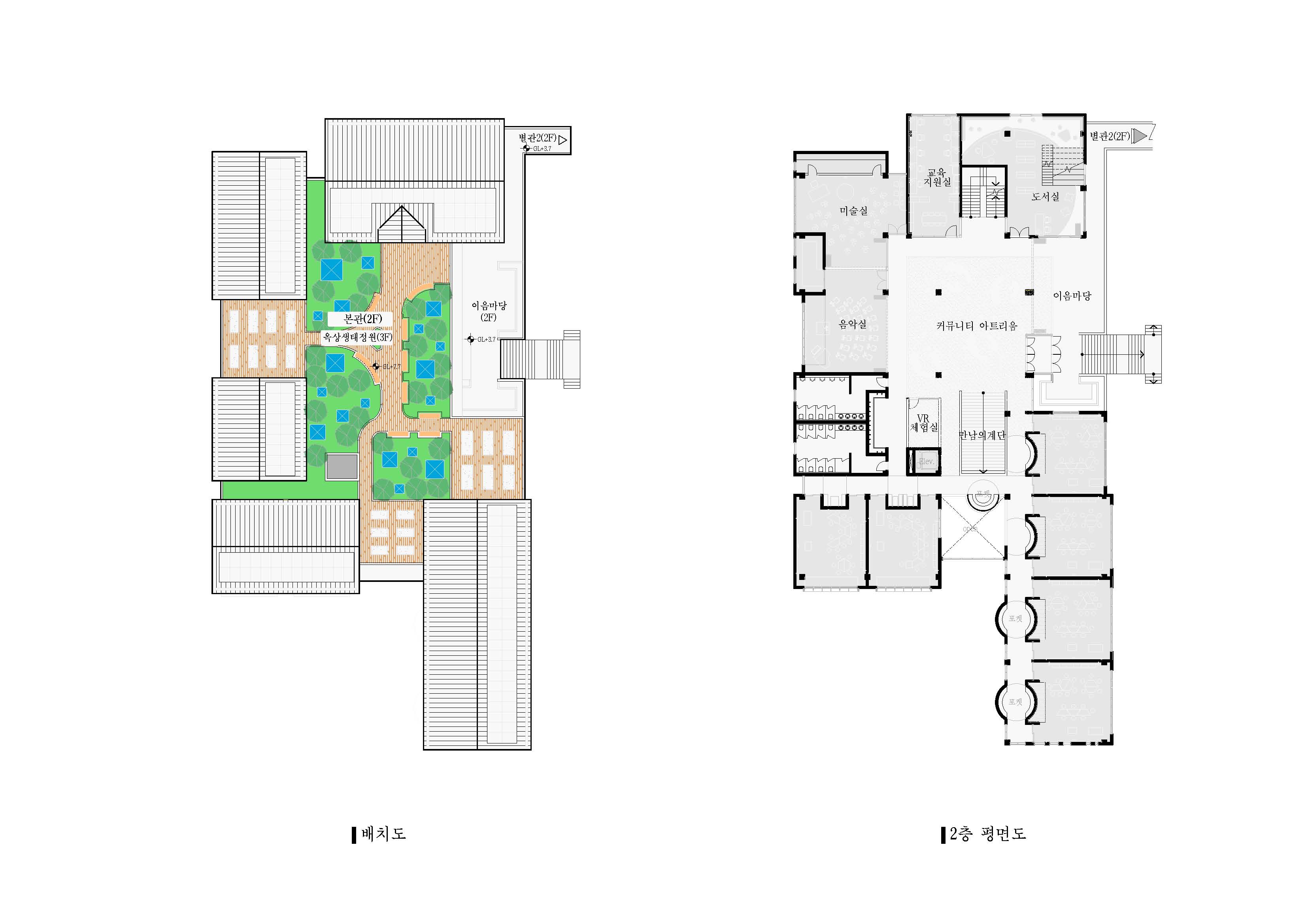 - 커뮤니티 아트리움을 중심으로한 도서실, 미술실, 음악실간 구성에 있어서, 도서실과 이음마당 연계를 통한 도서실 내 일조권과 외부 공간으로의 확장성을 확보하였고, 미술실/음악실과 커뮤니티 아트리움 연계를 통해 소통, 놀이 및 다양한 이벤트를 위한 가변형 공간을 제안