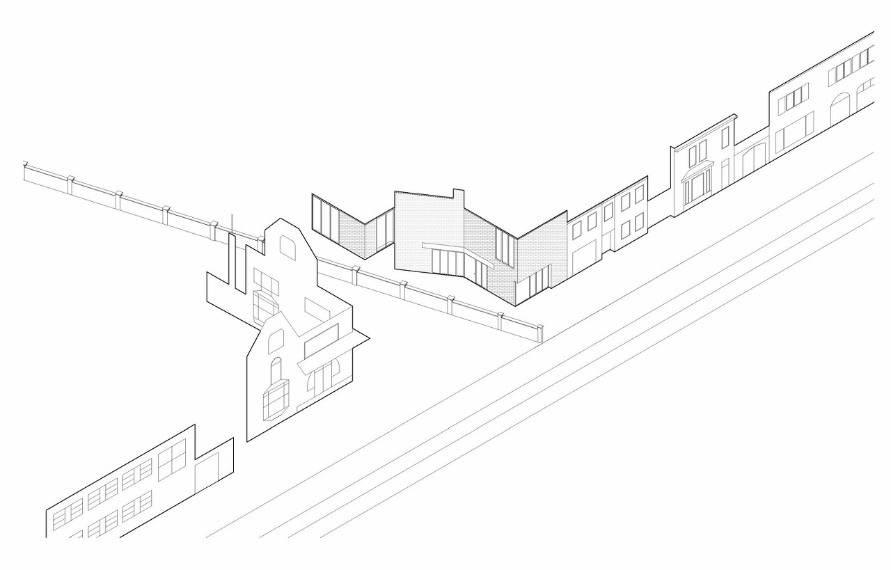 아래에 사진이 건물의 배치를 잘 설명해주고 있습니다. 낮은 2층 건물이 길을 따라 연속적으로 배치되어 있습니다. 그리고 이 연속적인 건물의 파사드가 건물의 입구를 통해 정면에서 측면까지 엇갈리게 연속적인 연결 하여 단조로운 진입을 생동감 있는 거리로 조성하였습니다.
