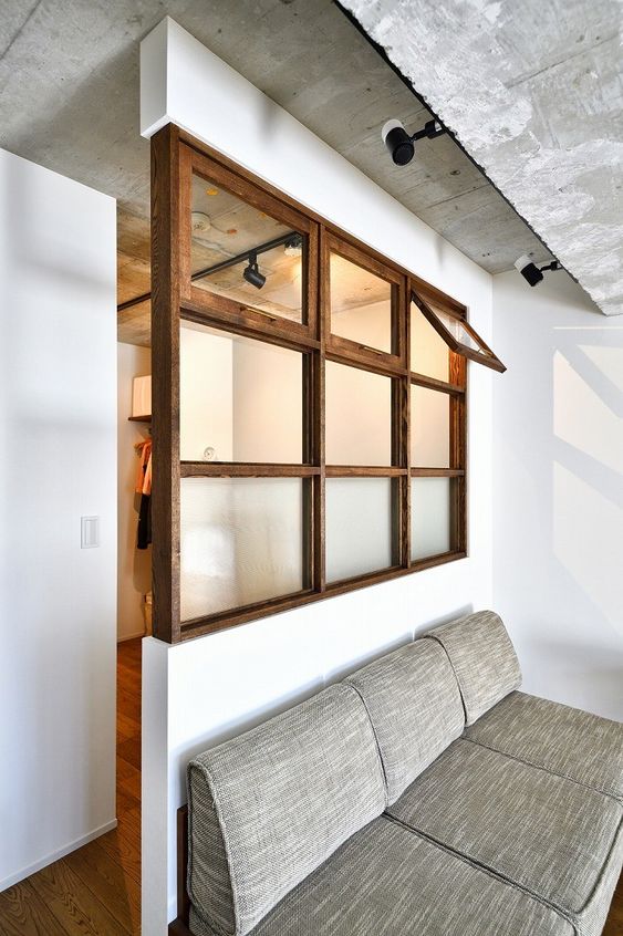 창문은 외벽에 다는 것뿐 아니라 건물 안에 칸막이벽을 만들 수도 있다. 실내창은 금속이 아니더라도 유리가 아니더라도 다양한 재료를 선택해서 사용할 수 있다. 실내창으로 나눠진 공간도 서로 연결되어 가족의 기척을 느끼기 쉬워진다. 고정된 창보다는 열고 닫을 수 있는 창문이면 목소리도 잘 들리고 통풍에도 유용하다.