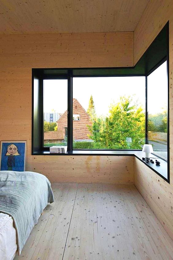 도심지에는 이웃집의 시선이 신경 쓰여 벽면에 큰 창문을 만들기 어려운 경우가 있다. 이런 경우는 방의 코너에 두 면에 걸쳐서 개구부를 잘라내면 똑같은 폭의 벽창보다 시야가 넓어지고 들어오는 빛의 양도 많아 진다. 또한 방의 모서리 벽면에 창문을 배치하면 이웃집 창문과 마주치기 어렵고 주위에 있는 건물과 건물 사이로 시선이 빠져나가기 쉬운 것도 장점이다. 하지만 코너에 내력벽이 필요한 경우도 있으니 구조적인 검토가 반드시 필요하다.