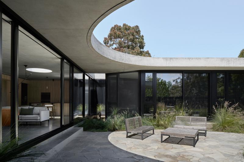 [Bobbanarring] is the indigenous name for the area. [Casa] references Oscar Niemeyer’s - Casa Canoas from 1951. The house is sited between a large open grassed area setback to the street and foreshore to the south and a vividly contrasting green
