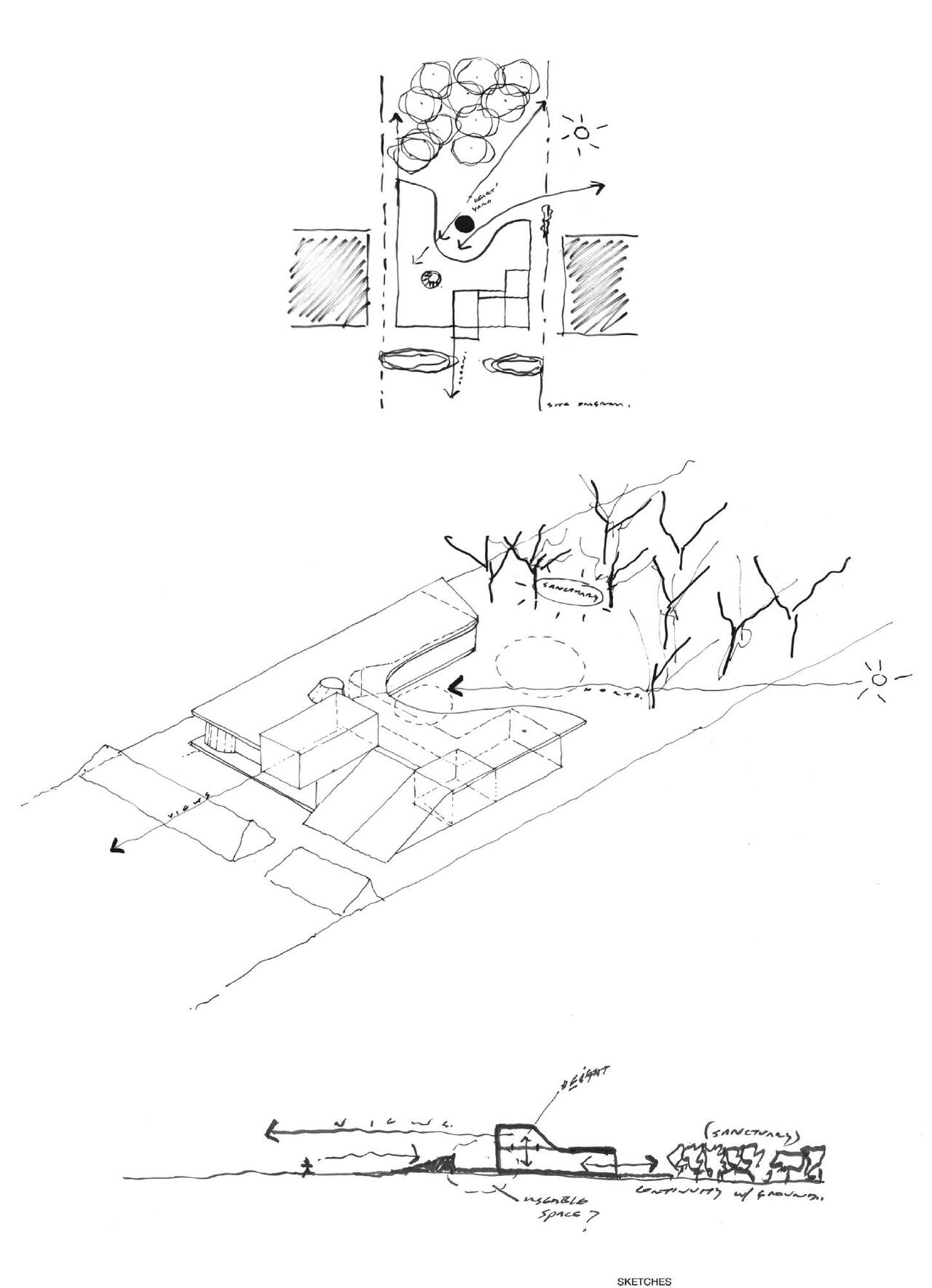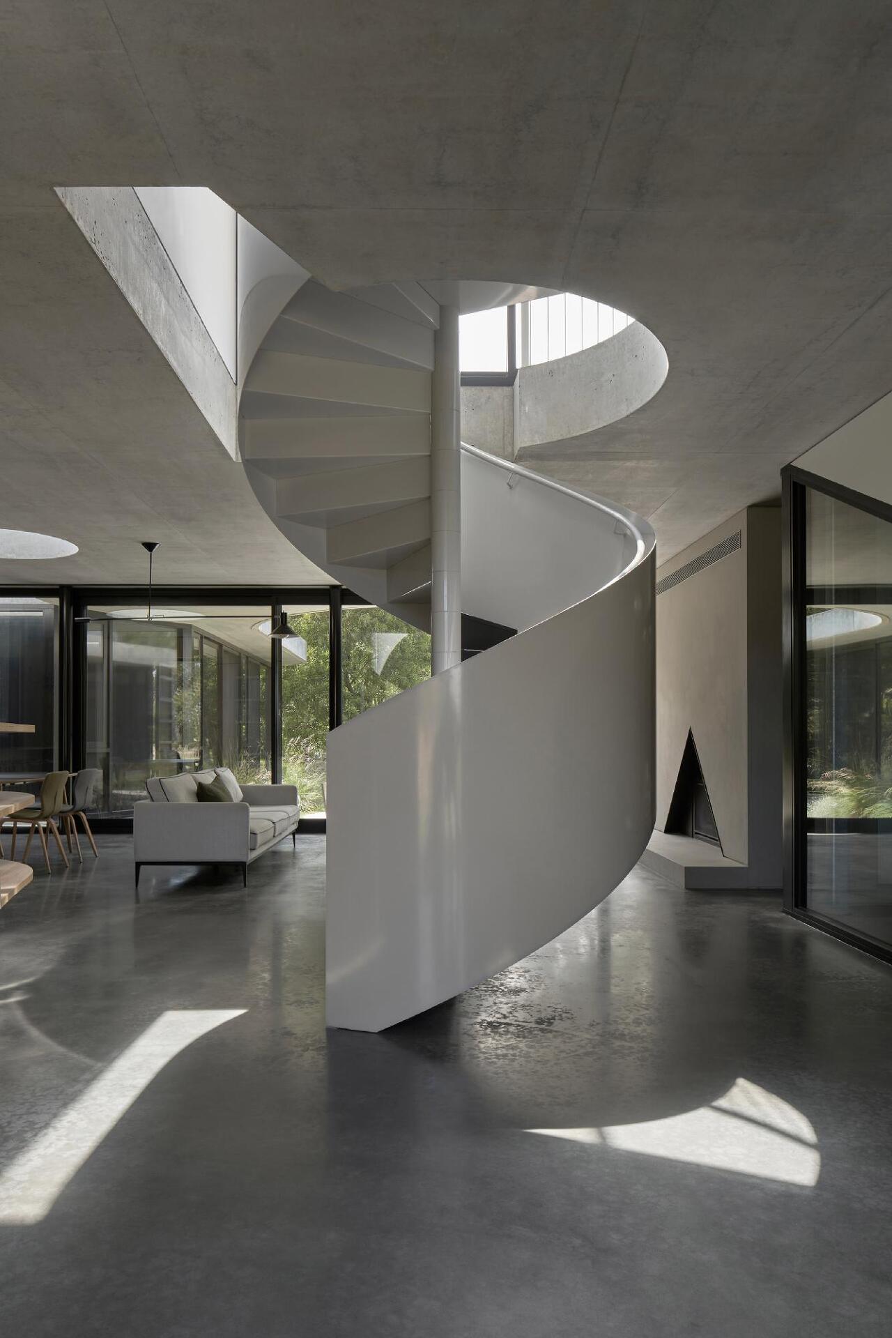 해당 주택은 동서(좌우)방향에 2층 집이 들어서 있어 남과 북으로 열린 관계를 유지하기 위해 설계되었습니다. 북쪽에 녹지가 풍부하고 남쪽 멀리 큰 바다가 보이는 것을 반영하려고 하였고, 건축주는 오랫동안 1951년에 지어진 브라질 건축가 오스카 니마이어(Oscar Niemeyer's)의 집인 카사 카노아스(Casa Canoas)를 염두해두고 있었습니다. 동서로 막혀있어 남북으로 개방성과 내부와 외부의 원활한 교차로 연결성을 갖추도록 하였고, 단층의 수평으로 넓게 펴진 배치형태를 콘크리트 캐노피로 수평성과 곡선의 형태로 공간을 부드럽게 이어주고 있습니다. 침실은 대부분 도로에서 멀리 배치하여 북측 녹지에 모두 면하게 하여 숲 풍경을 향하고 있고, 남측에는 다용도의 역할을 하는 서재, 음향실, 취미실, 차고, 갤러리, 세탁실 등 공용의 공간으로 구성되어 있습니다.