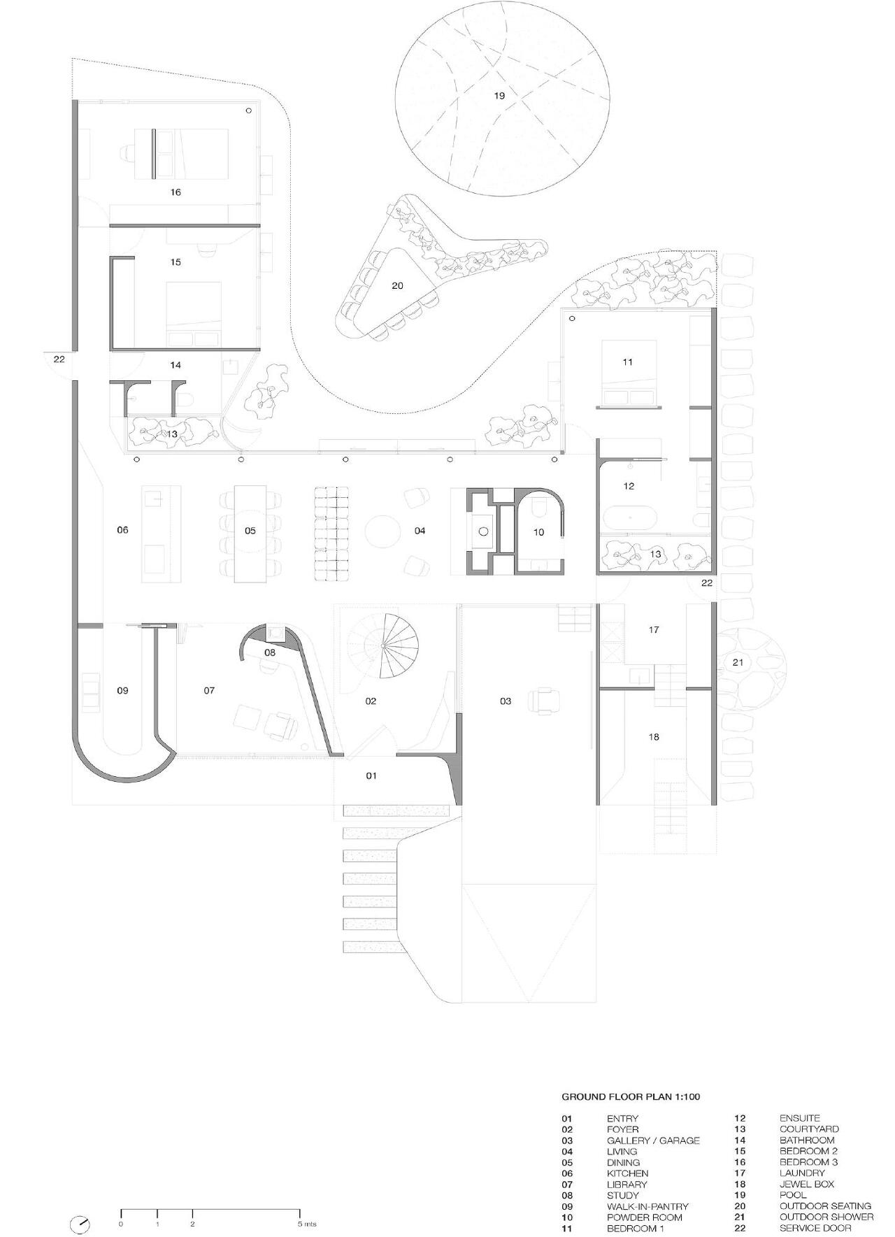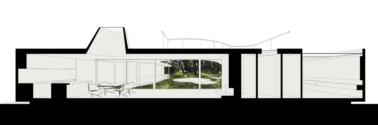 해당 주택은 동서(좌우)방향에 2층 집이 들어서 있어 남과 북으로 열린 관계를 유지하기 위해 설계되었습니다. 북쪽에 녹지가 풍부하고 남쪽 멀리 큰 바다가 보이는 것을 반영하려고 하였고, 건축주는 오랫동안 1951년에 지어진 브라질 건축가 오스카 니마이어(Oscar Niemeyer's)의 집인 카사 카노아스(Casa Canoas)를 염두해두고 있었습니다. 동서로 막혀있어 남북으로 개방성과 내부와 외부의 원활한 교차로 연결성을 갖추도록 하였고, 단층의 수평으로 넓게 펴진 배치형태를 콘크리트 캐노피로 수평성과 곡선의 형태로 공간을 부드럽게 이어주고 있습니다. 침실은 대부분 도로에서 멀리 배치하여 북측 녹지에 모두 면하게 하여 숲 풍경을 향하고 있고, 남측에는 다용도의 역할을 하는 서재, 음향실, 취미실, 차고, 갤러리, 세탁실 등 공용의 공간으로 구성되어 있습니다.