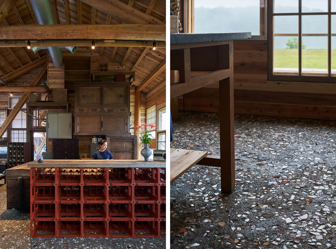 처마 밑 빗물받이의 경계에 사용하는 타일재료는 빈집을 정리하던 주민이 재사용해달라는 요청으로 사용되었다. 깨진 유리조각과 도자기 조각, 식기류는 파유리로 바뀌고 재사용 상점의 모르타르 바닥마감을 위한 테라조 골재로 사용되었다.