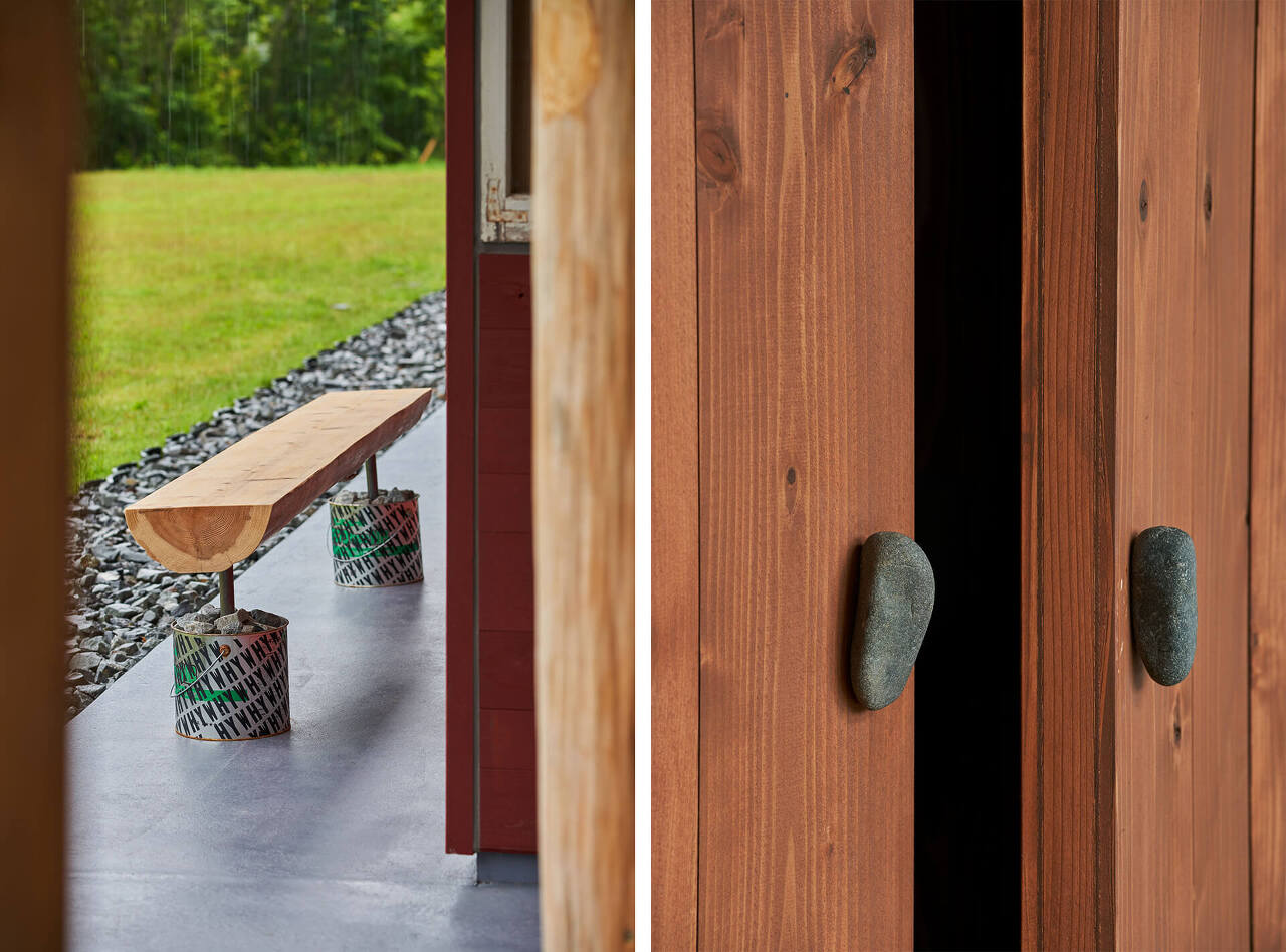 건축하고 남은 페인트통은 재활용하여 벤치로 만들고 흙바닥과 잔디 사이의 경계는 폐기와를 사용하여 파쇄하여 포장하였다. 마을의 돌을 이용하여 문 손잡이를 만들었다.