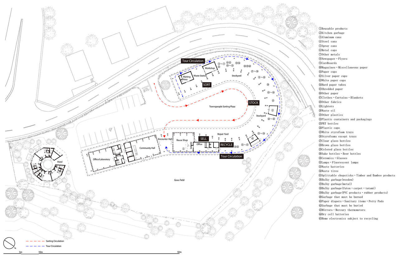 재활용 센터는 재활용 활동을 위한 중심점을 제공하고 참여자들이 커뮤니티 홀, 재사용 상점, 활동 공간 및 호텔을 포함하여 방문자와 아이디어와 가치를 공유할 수 있도록 합니다.
