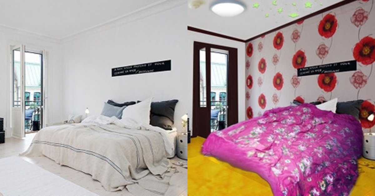 벽지무늬는 연하고 작은 것은 원근법에 따라 벽면에 멀게 느껴진다. 그리고 이 특성을 커튼을 선택할 때도 적용될 수 있다.