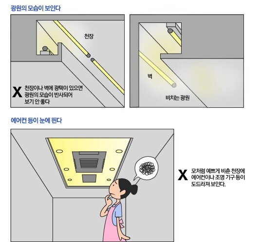 천장이나 벽을 비출 때 기구나 램프가 잘 감춰져 있어도 그 모습이 천장면이나 벽면에 비치는 경우가 있다. 천장이나 벽소재가 광택이 나는 소재면 반사되어 숨기는 의미가 퇴색될 수 있으니 무광이나 질감이 있는 소재로 마감하는게 좋다.
