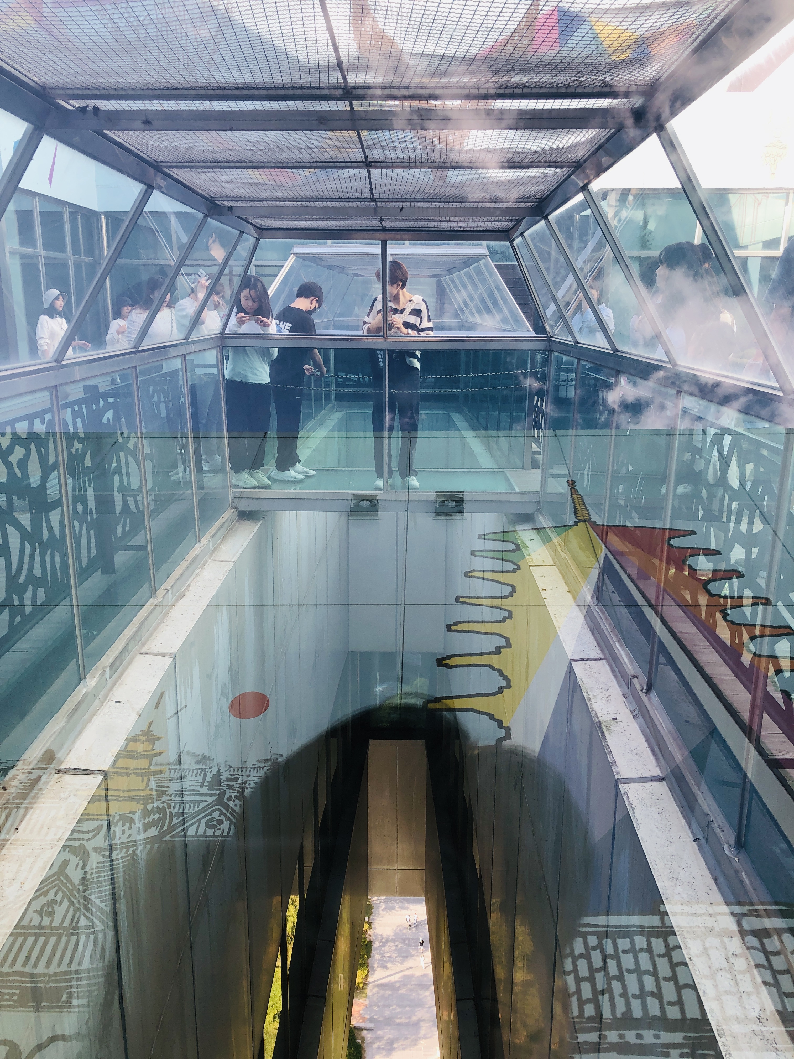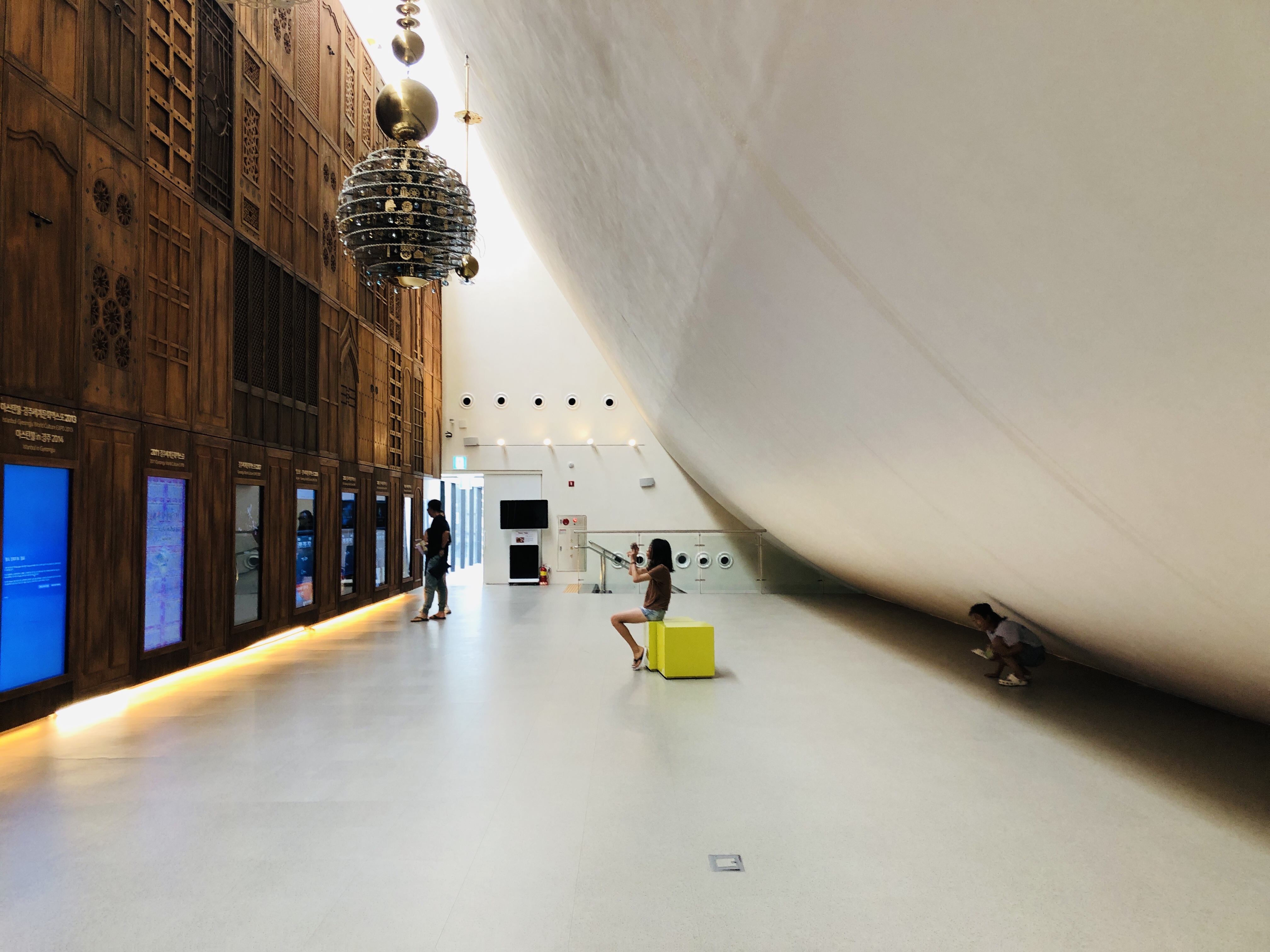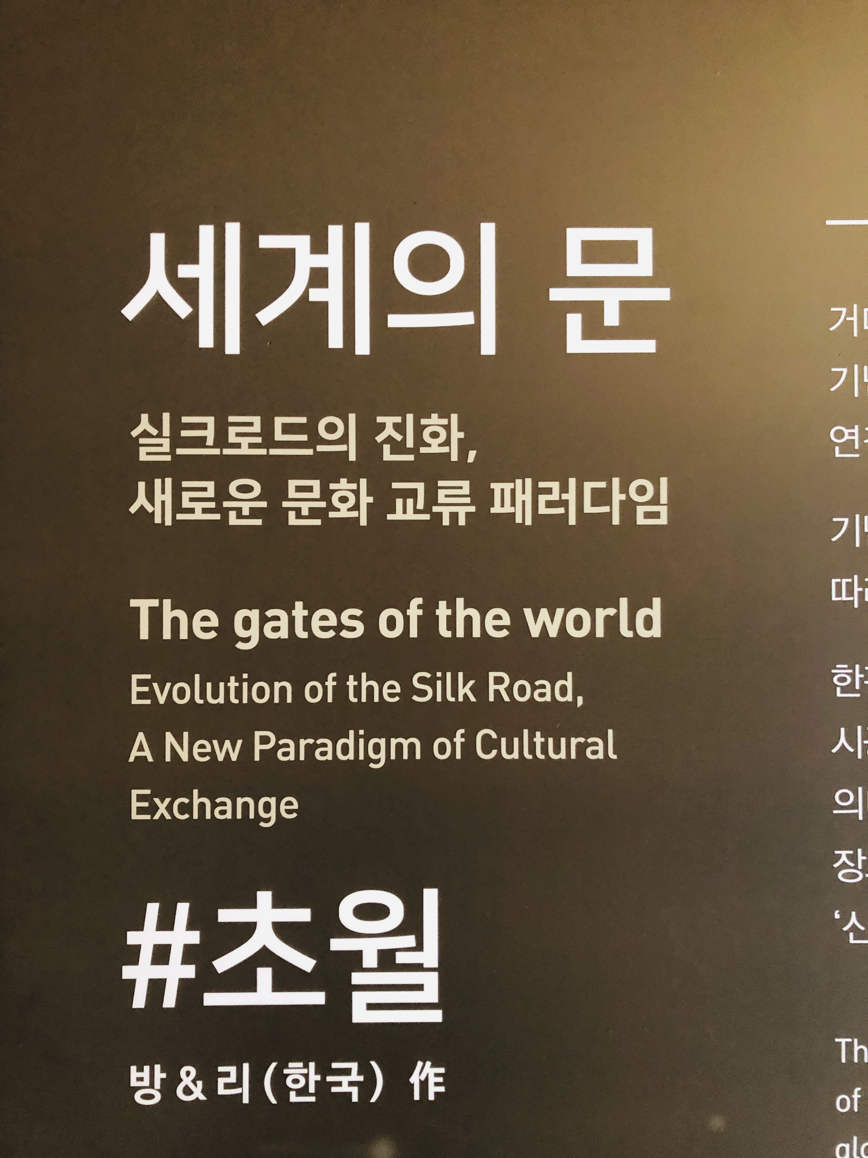 문화의 통합과 연결, 융합이라는 주제를 가지고, 세계의 다양한 문과 영상을 전시해 두었다. 전시 반대편 곡면이 천창으로 인해 색 다른 공간감을 느끼게 해 준다.