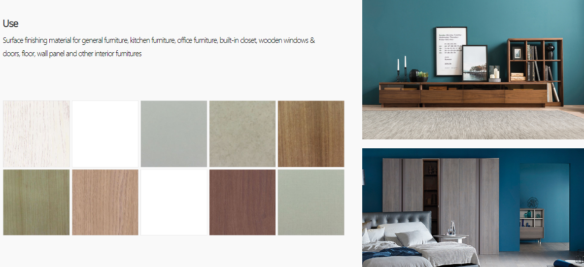 가공목재에 접합하는 과정에서 접착제 대신 높은 온도와 압력을 가해, 모양지에 스며들어 있던 수지가 녹아 나와 서로 붙게 한다. 반무광과 무광, 유광(하이그로시), 엠보 등으로 다양한 연출이 가능하고 강도를 조절할 수 있고 외부충격에 강해 붙박이장, 수납장 상판 등 폭넓게 쓰인다.