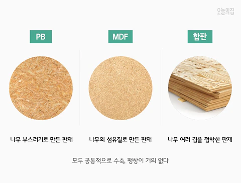 - MDF와 마찬가지로 물에 약해 싱크대 자재로는 부적합하다.