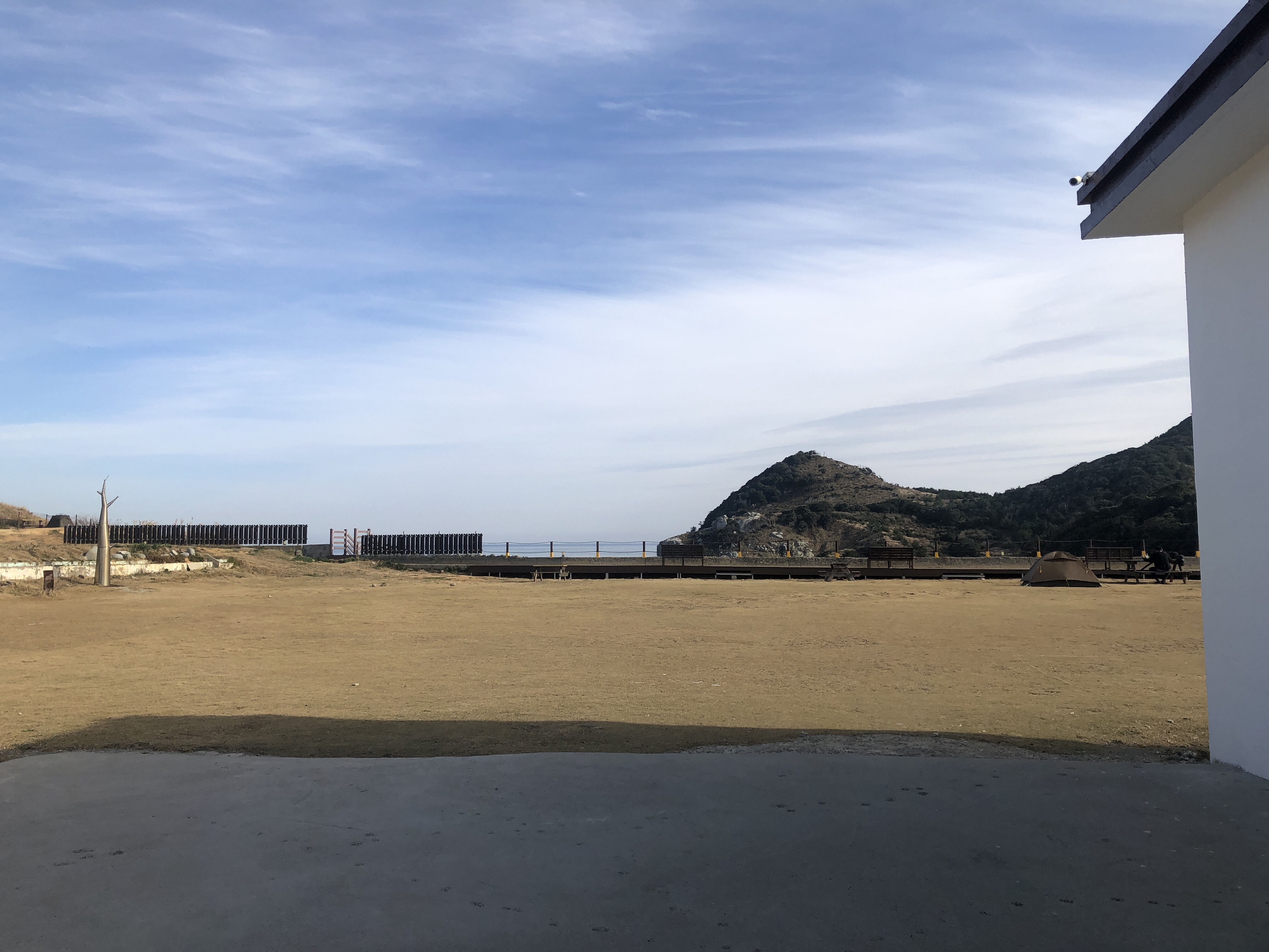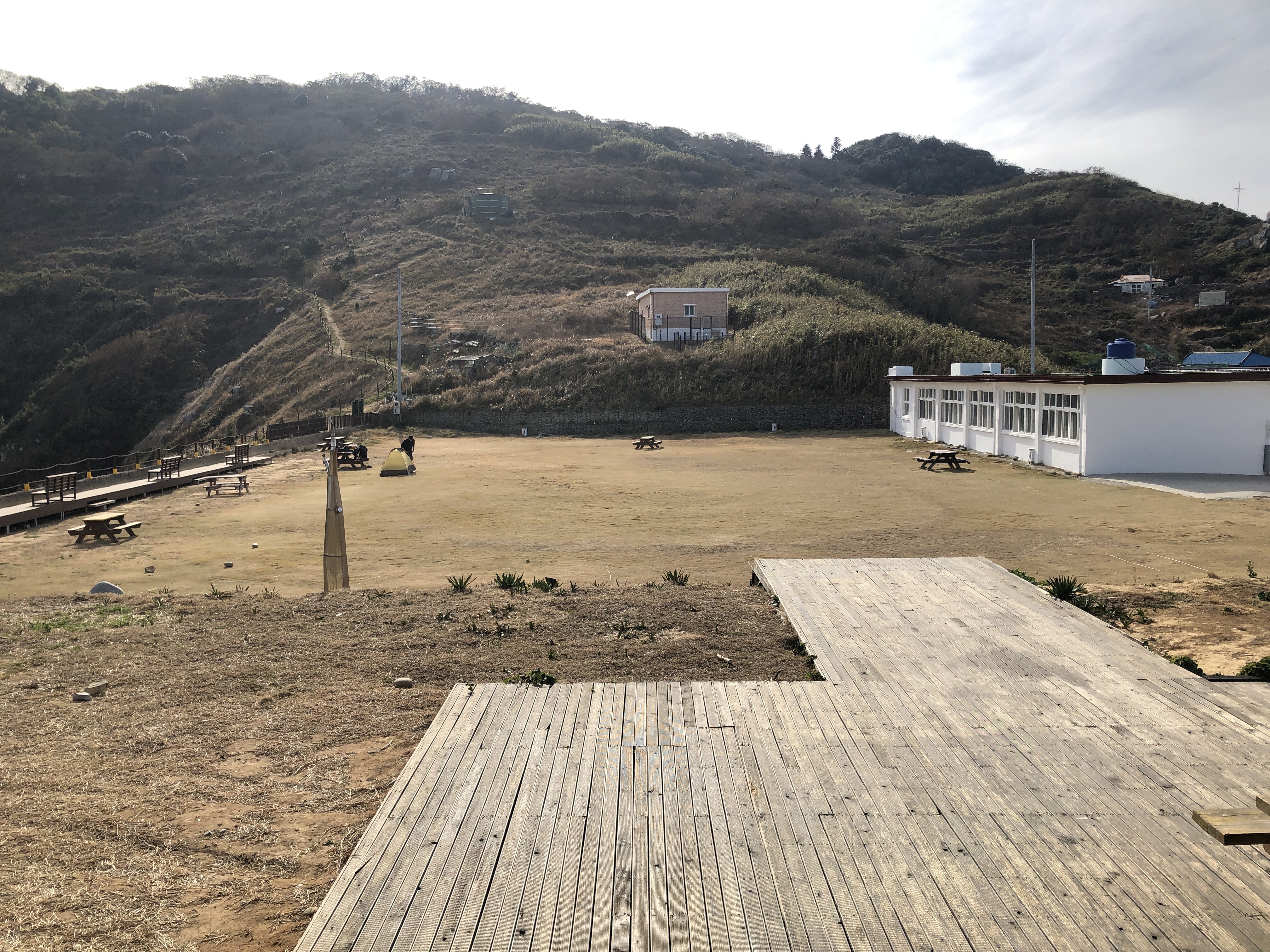 분교건물의 반대방향 끝은 바다조망이며 데크로 조성되어 있고, 목재로 된 둔탁한 난간이 있어 운동장에 텐트를 치게 조망이 막힌다. 그래서 텐트밖으로 나와야 바다를 볼 수 있게 된다. 텐트에서 보는 전망이 막혀서 운동장에 텐트를 치는 것은 좋아 보이지 않는다. 옆으로 조금 이동하게 되면 난간은 없으나 시원한 바다뷰는 어렵지만 그래도 섬도 일부 보이고 바다도 보이는 곳에 텐트를 설치한다.