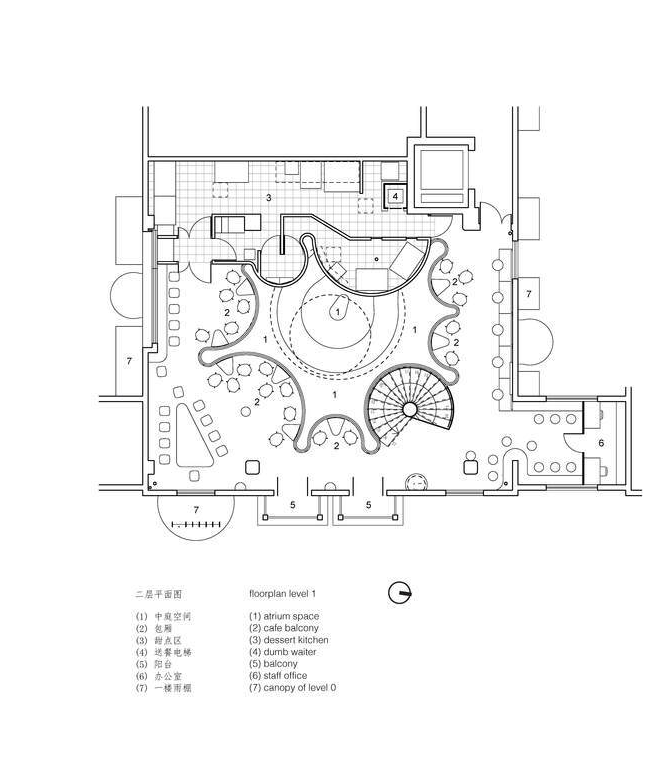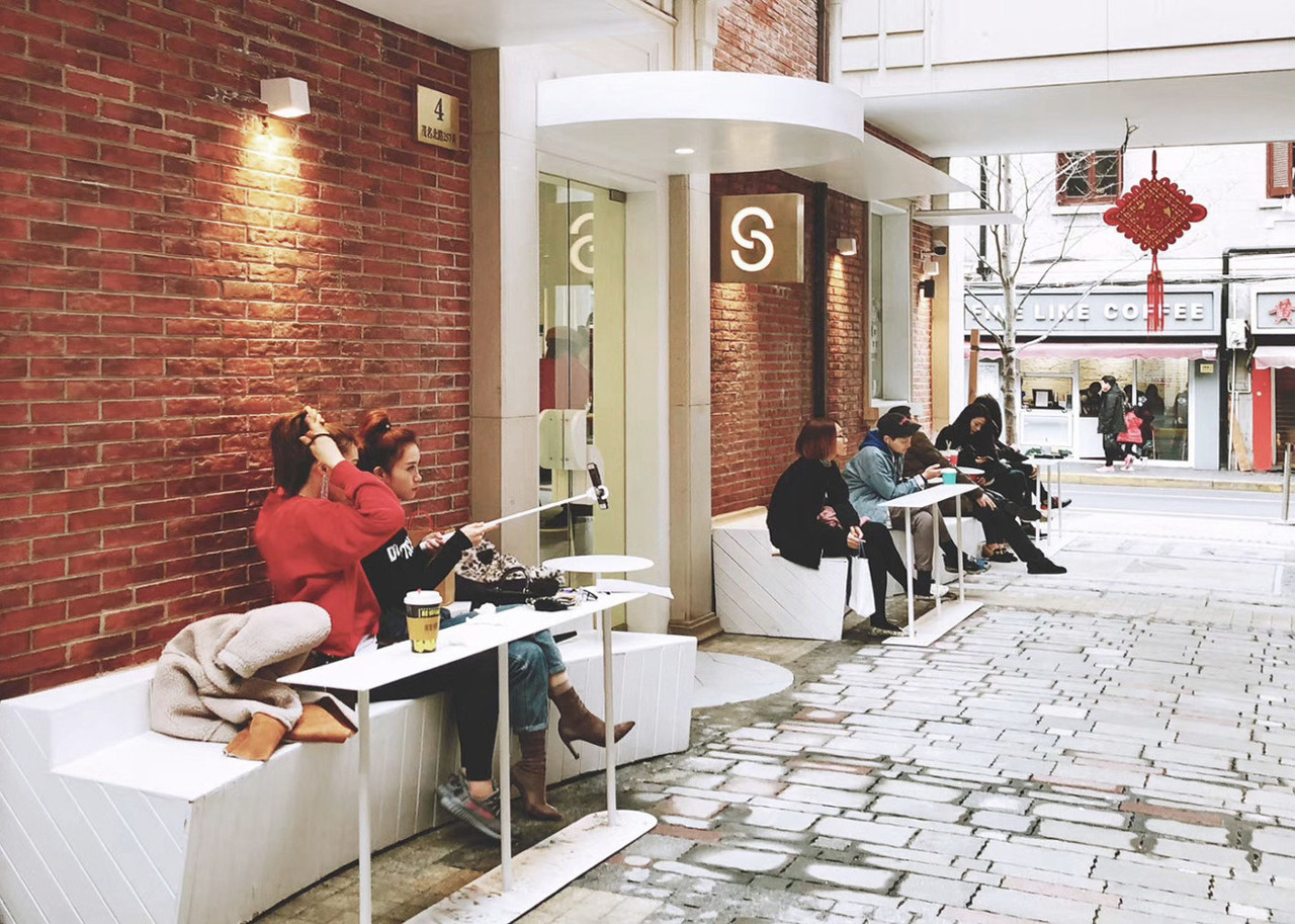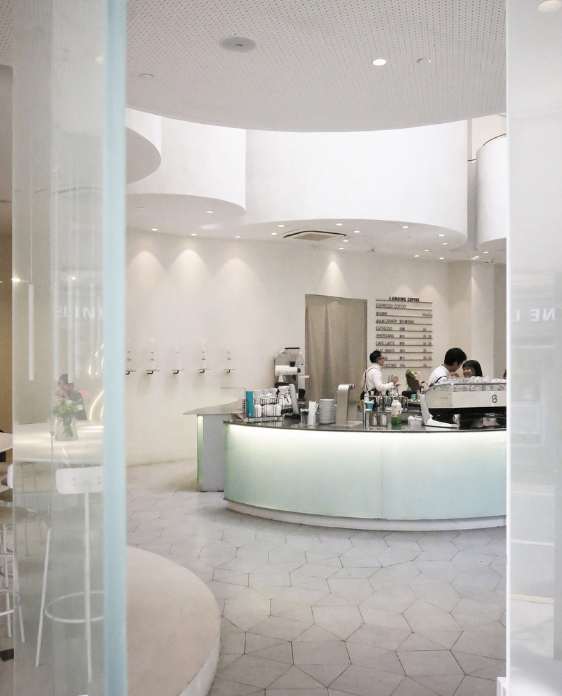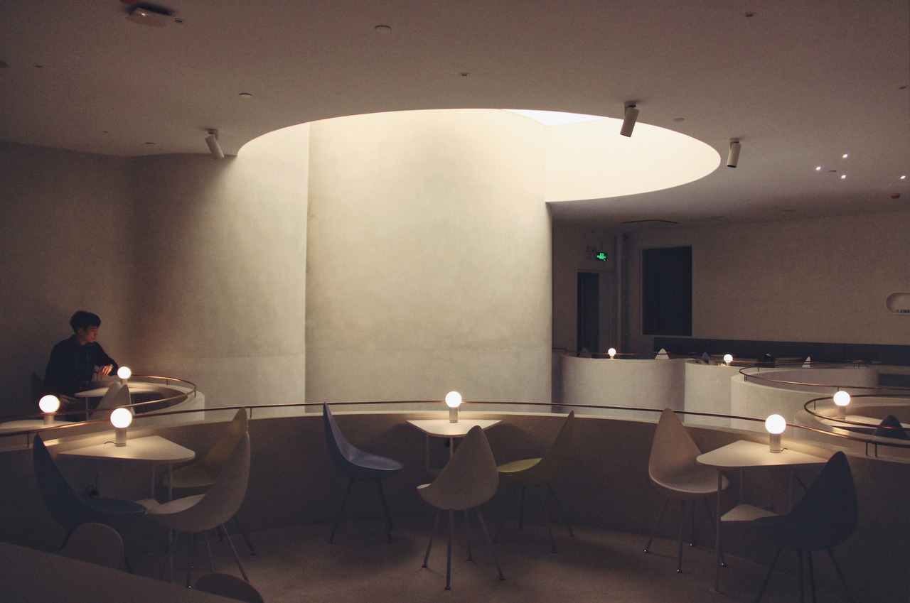 중국 상하이의 가장 번화한 쇼핑지구에 위치한 카페는 바쁘게 움직이는 사람들 속에서 휴식과 평화로움을 주기 위한 공간컨셉으로 디자인되었다. 흰백색의 공간과 하늘로 열려진 원형의 아뜨리움, 그리고 공중에 떠있는 2층의 구름과 같은 카페공간이 사람들에게 바쁜일상에 영혼의 자유로움을 선물하고 있다. 공간이 가진 원형의 모습이 천창의 빛으로 인해 형태와 공간이 더욱 부각된다. 이 도시의 거리와는 대비되는 정적인 공간으로 디자인 되었다.