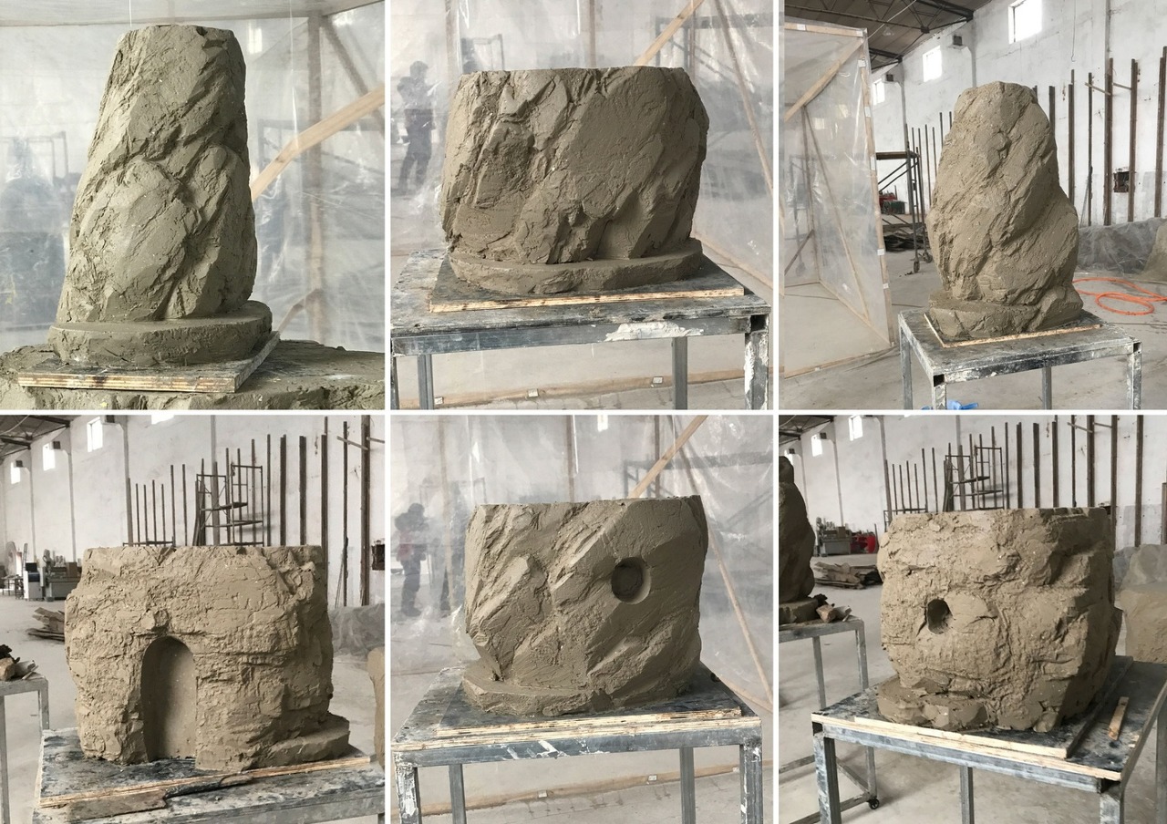 돌의 형상은 GRC( Glass fiber reinforced concrete:유리섬유 강화콘크리트) 타설로 만들어졌고 콘크리트의 자연스러운 질감을 드러내고 있다. 여러 개의 모듈로 타설을 한 뒤 현장에서 조립하기 위해서 운송된다.