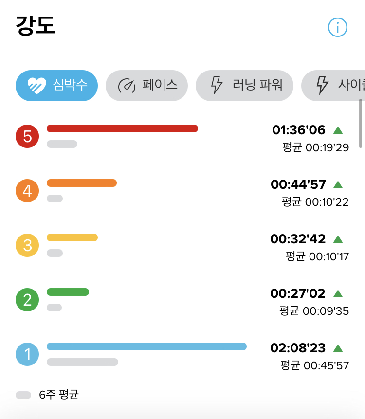 - 강도구분과 운동시간 : 1~2단계 중강도운동(2시간 35분), 3~5단계 고강도 운동(2시간 52분)