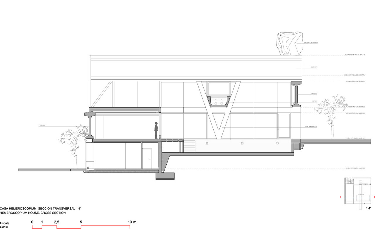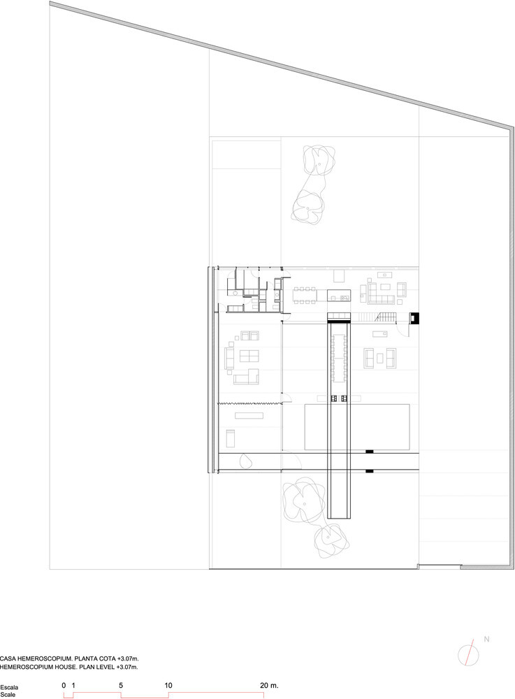 Text description provided by the architects. For the Greek, Hemeroscopium is the place where the sun sets. An allusion to a place that exists only in our mind, in our senses, that is ever-changing and mutable, but is nonetheless real. It is delimited by the references of the horizon, by the physical limits, defined by light, and it happens in time. Hemeroscopium house traps, a domestic space, and a distant horizon. And it does so playing a game with structures placed in an apparently unstable balance, that enclose the living spaces allowing the vision to escape. With heavy structures and big actions, disposed in a way to provoke gravity to move the space. And this way it defines the place.