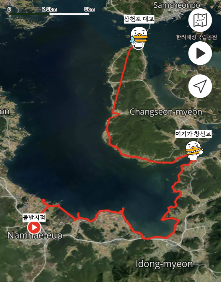 - 경로: 남해공용터미널->창선교->자족마을방향->창선대교(삼천포대교)