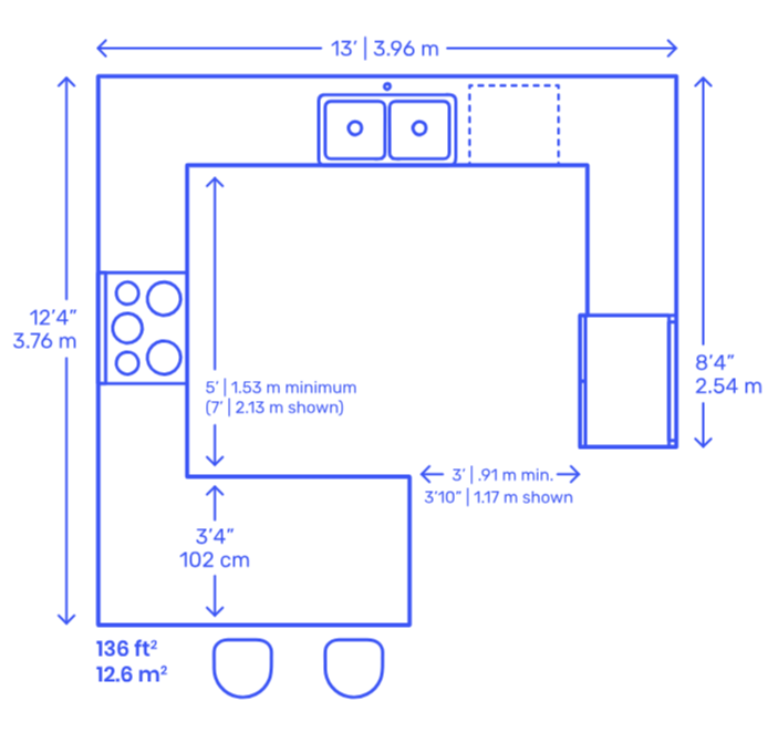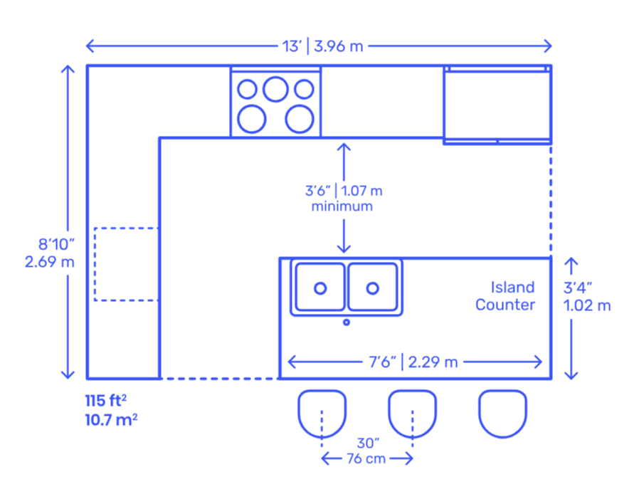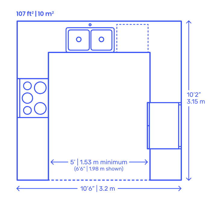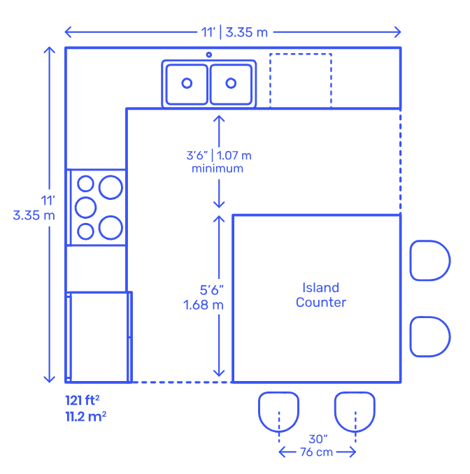 주방공간의 배치는 요리, 설거지 등과 같은 작업이 일어나는 작업대를 중심으로 이루어진다. 작업대의 치수 중에 높이는 키와 팔꿈치 높이를 기준으로 820~850mm 정도, 깊이는 손을 뻗었을 때 닿는 범위인 600mm 정도가 적당한 치수이다.
