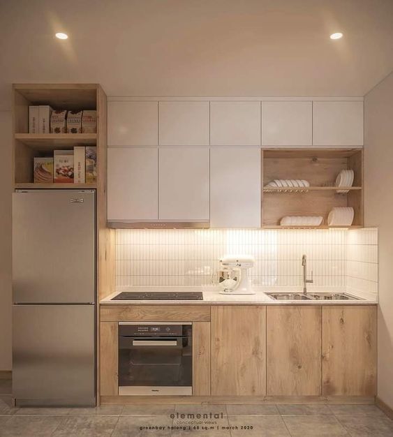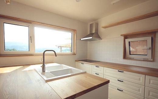 - 가열대 : 음식을 익히는 영역으로 가스레인지나 전기레인지, 오븐 등을 두고 상부에는 후드와 같은 환기설비를 둔다. 상판은 뜨거운 냄비를 올려둘 수 있는 내열성이 있는 소재의 상판으로 설치