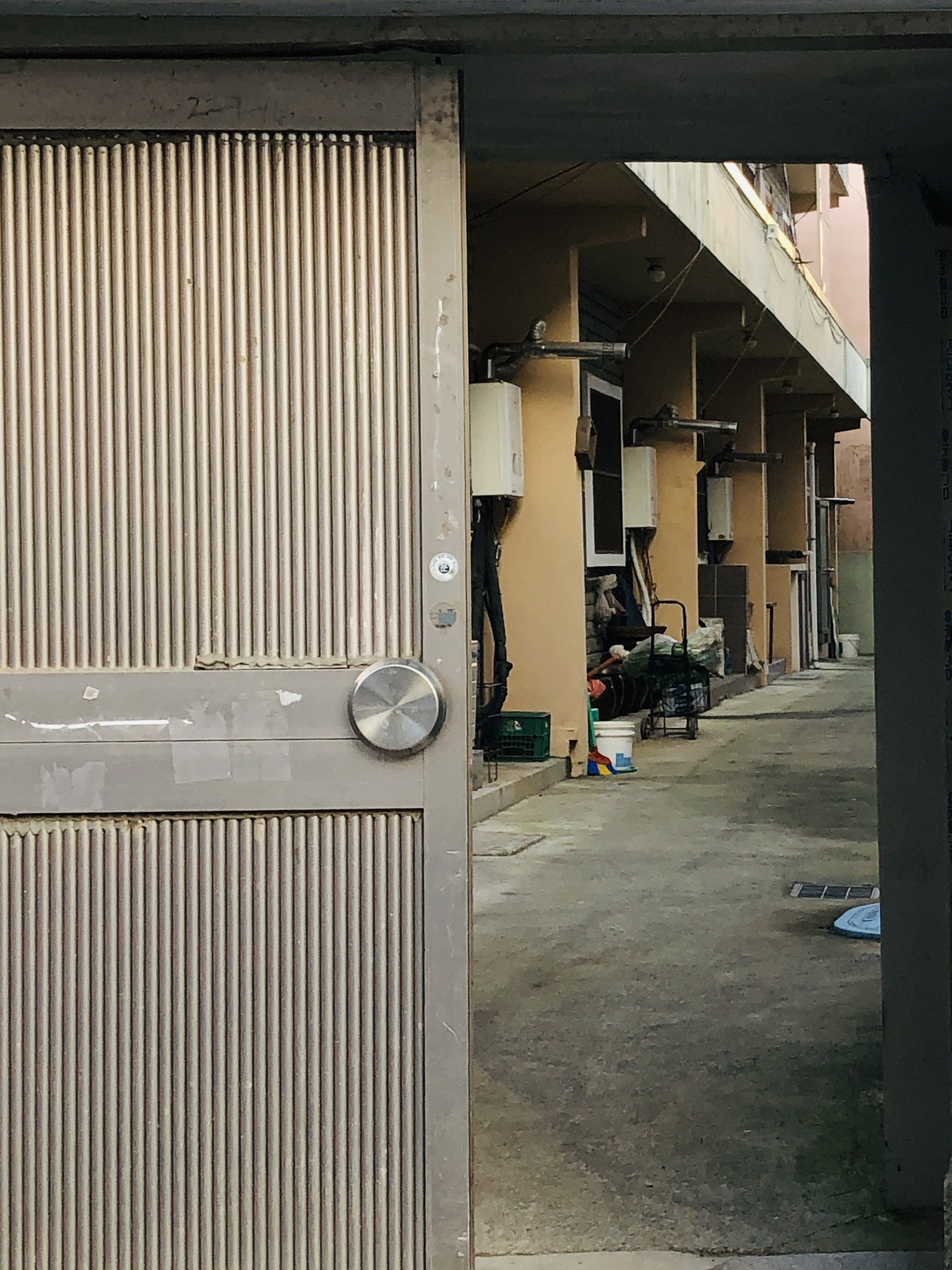 단독주택 건물의 현관이 열려 있어 빼꼼 쳐다봤는데, 공동주택이었다. 세대 간 날개벽과 보일러실 연통이 가지런하다. 따듯함과 삭막함이 동시에 느껴지는 조용한 공동주택으로 세대수는 등재되어 있지 않은 2층 다세대주택 @석전동, 1979