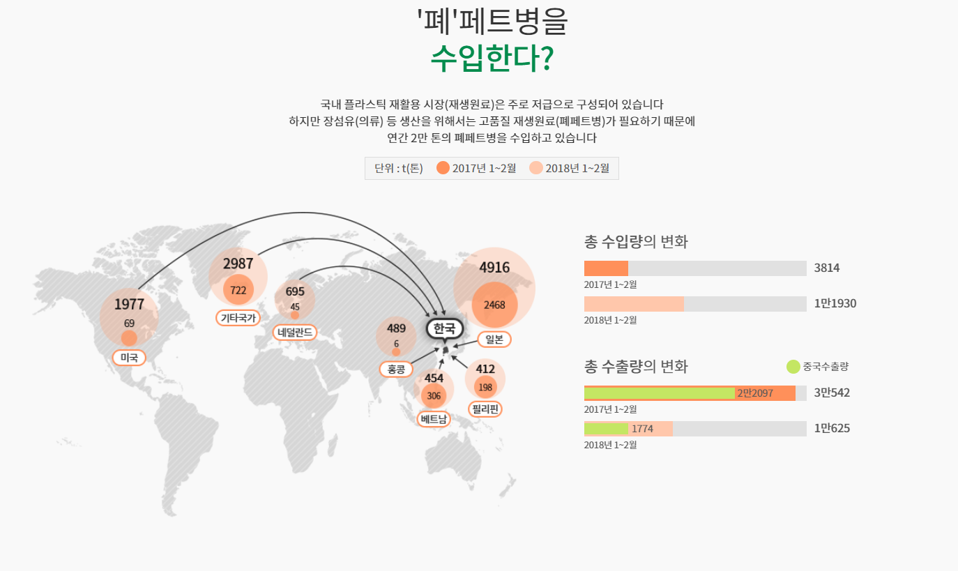 국내 플라스틱 재활용 시장은 주로 저급으로 구성되어 있지만 장섬유(의류) 등 생산을 위해서는 고품질 재생원료(폐페트병)가 필요학 때문에 연간 2만 톤의 폐패트병을 수입하고 있다.