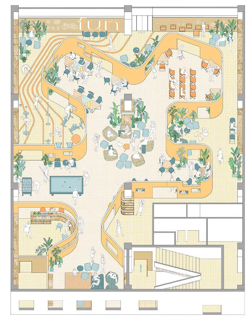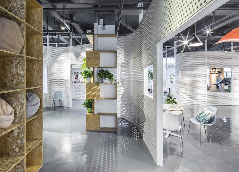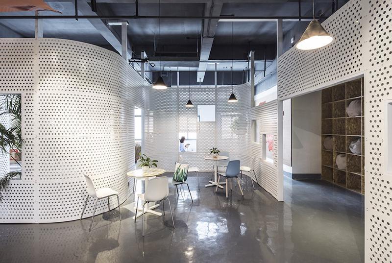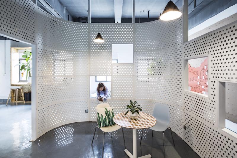 ▶펀칭메탈의 반투시적 효과와 끝없이 연속되는 곡면벽를 이용한 사무실 레이아웃