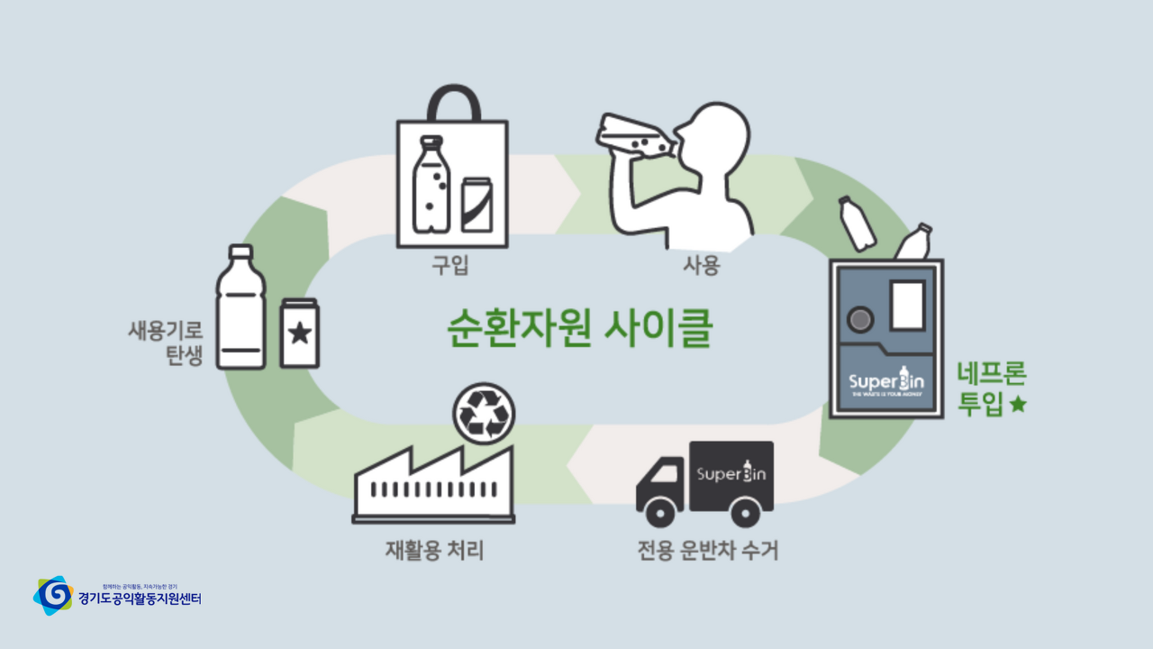 네프론 사용은 "수퍼빈 앱설치-> 네프론 시작버튼->번호입력->재활용품 투입"