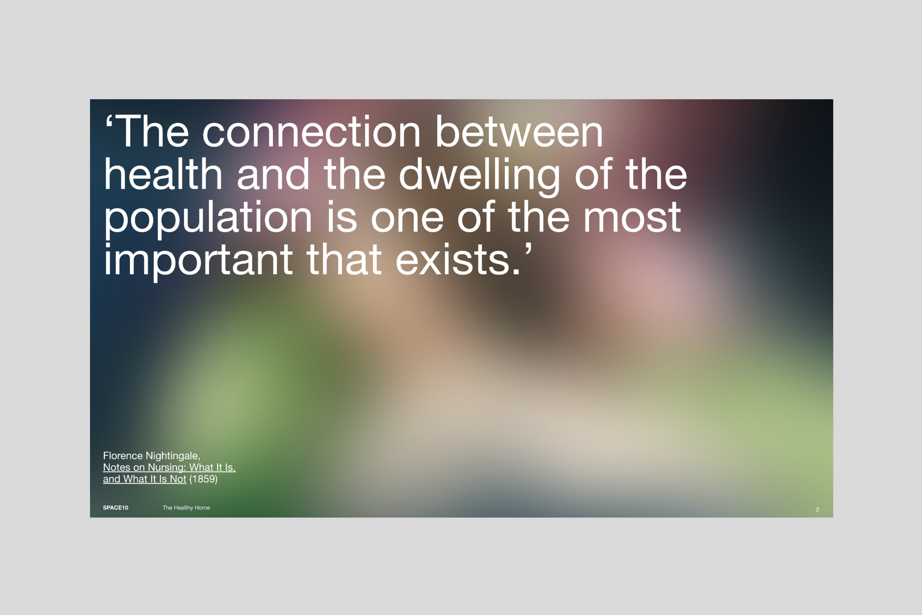 '건강한 집' 보고서는 미래의 집이 어떻게 위협으로부터 우리는 보호하고 몸과 마음을 회복시키며 삶의 성장을 돕는 장소가 되는지 20개국의 사례를 통해 설명하고 정리한다. 그리고 보호, 회복, 가능성이라는 세 가지 주제를 통해 건강한 가정을 만들기 위한 기술과 노력을 소개함으로써 먼 미래의 이야기만이 아님을 보여준다.