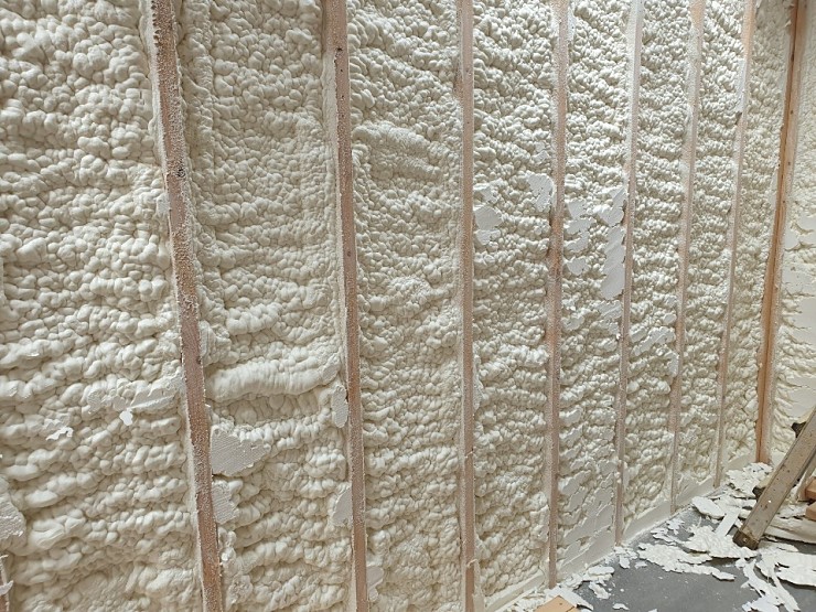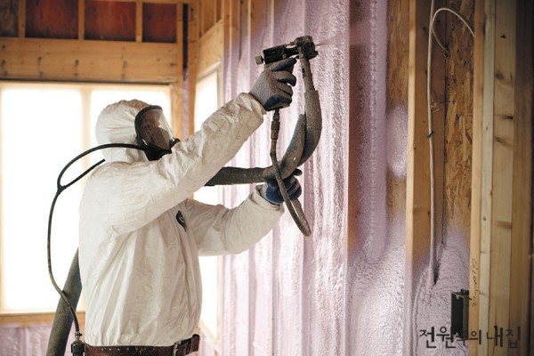 | 스프레이 폼으로 발포해 시공하는 폴리우레탄 소재의 단열재, 모서리까지 밀실하게 채울 수 있어 단열성능을 높이는데 도움이 된다. 모세관 현상이 없어 수분을 흡수하지는 않지만, 내부에 결로수가 생기면 하자로 이어질 가능성이 커 방습층을 설치하는 등의 시공에 주의가 필요하다. |