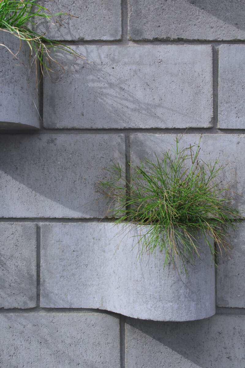 담장의 기능성에 디자인이 더해져 집의 완성도를 높여준다. 그중에 담장을 활용해 수직정원을 조성하는 사례들을 몇몇 볼 수 있다. BLOCASA사에서 만든 수직정원블럭으로 만들어진 담장을 살펴본다. 일반적인 시멘트블럭에서 부분적으로 돌출된 면을 곡면으로 처리한 이형블럭 형식이다. 이 블럭은 14x19x39cm의 크기로 토심 14cm 정도에서 서식하는 식물을 기를 수 있다. 수직정원으로 사용되는 블럭을 이용하여 담장의 패턴을 만들고 사용에 따라 적절한 위치에 담장을 설치할 수있다. 적절한 위치는 건물의 평면계획 및 배치계획과 물려서 결정할 수 있을 것 같으며, 거실에서 담장을 바라보는 위치에 수직정원을 설치하거나, 외부에서 건물로 들어오는 방향으로 수직정원을 설치할 수 도 있겠다. 또는 사람의 시선에서 식물이 보일 수 있는 건물의 외벽에 부분적으로 수직정원이 가능한 블럭을 사용해도 되겠다.