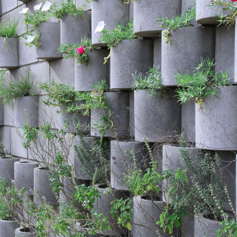 담장의 기능성에 디자인이 더해져 집의 완성도를 높여준다. 그중에 담장을 활용해 수직정원을 조성하는 사례들을 몇몇 볼 수 있다. BLOCASA사에서 만든 수직정원블럭으로 만들어진 담장을 살펴본다. 일반적인 시멘트블럭에서 부분적으로 돌출된 면을 곡면으로 처리한 이형블럭 형식이다. 이 블럭은 14x19x39cm의 크기로 토심 14cm 정도에서 서식하는 식물을 기를 수 있다. 수직정원으로 사용되는 블럭을 이용하여 담장의 패턴을 만들고 사용에 따라 적절한 위치에 담장을 설치할 수있다. 적절한 위치는 건물의 평면계획 및 배치계획과 물려서 결정할 수 있을 것 같으며, 거실에서 담장을 바라보는 위치에 수직정원을 설치하거나, 외부에서 건물로 들어오는 방향으로 수직정원을 설치할 수 도 있겠다. 또는 사람의 시선에서 식물이 보일 수 있는 건물의 외벽에 부분적으로 수직정원이 가능한 블럭을 사용해도 되겠다.