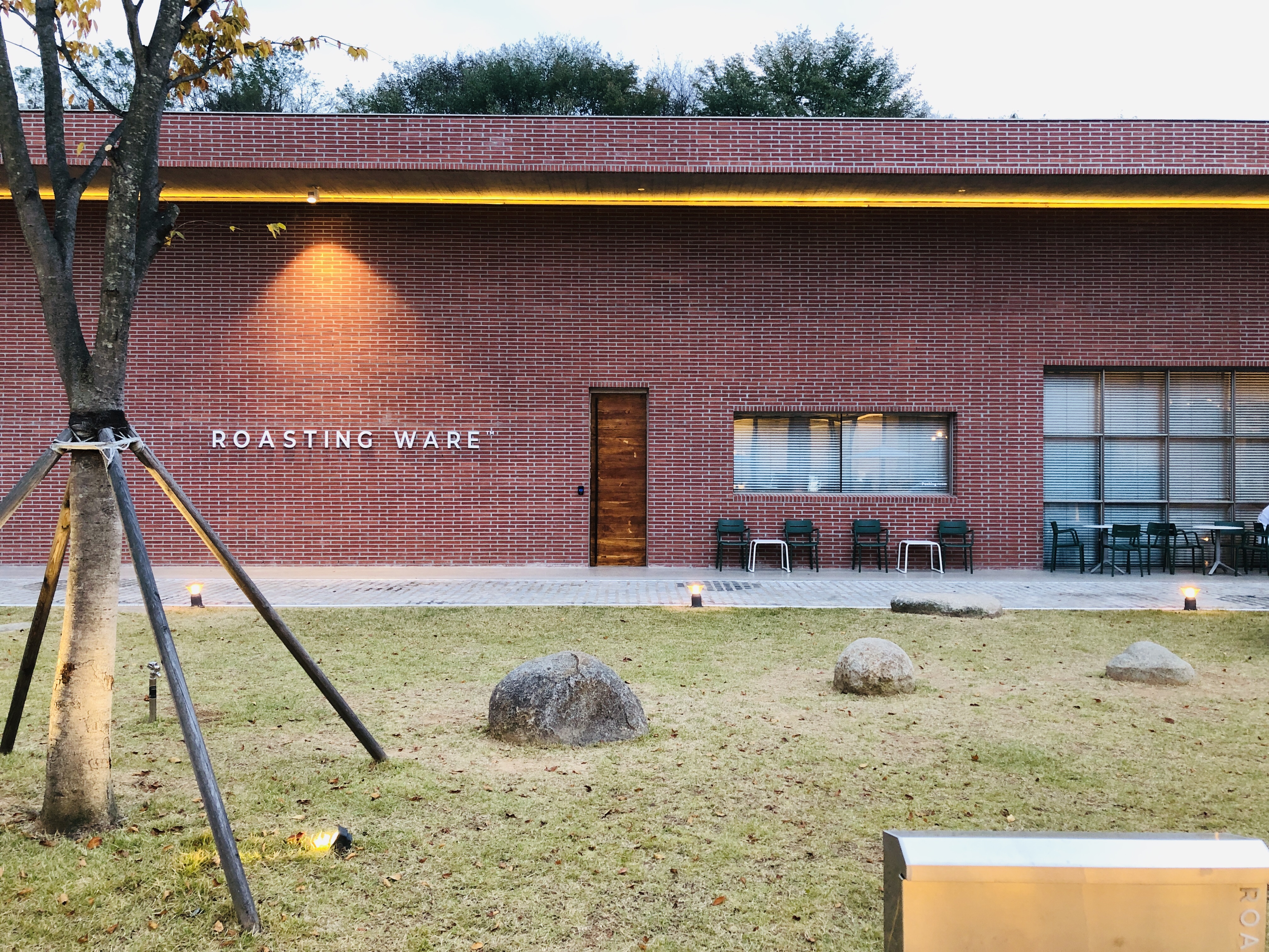 진주 로스팅웨어의 주차장과 건물은 서로 등을 돌린 채 건물의 모습을 숨기고 있다. 카페와 사무실(공장) 사이 띄워진 건물사이로 진입하여 카페에서는 주차장을 전혀 볼 수 없는 배치를 하고 있다. 미송무늬 노출콘크리트를 한 거친 재료가 주차장에서 떡하니 마주친다. 입구라고 볼 수 있는 곳이 건물과 건물사이 틈 밖에 없다. 자연스레 발걸음이 옮겨진다.
